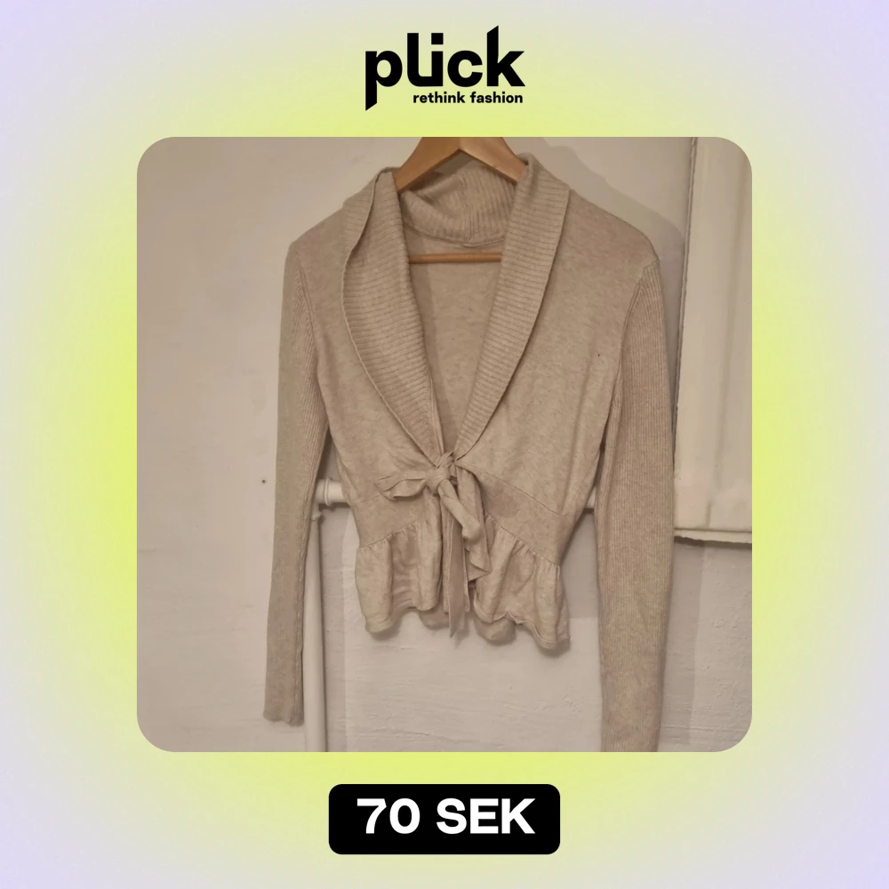 beige stickad kofta med knyt framtill. Långa ärmar och en volangdetalj vid nederkanten. Storlek S och är i Bra skick