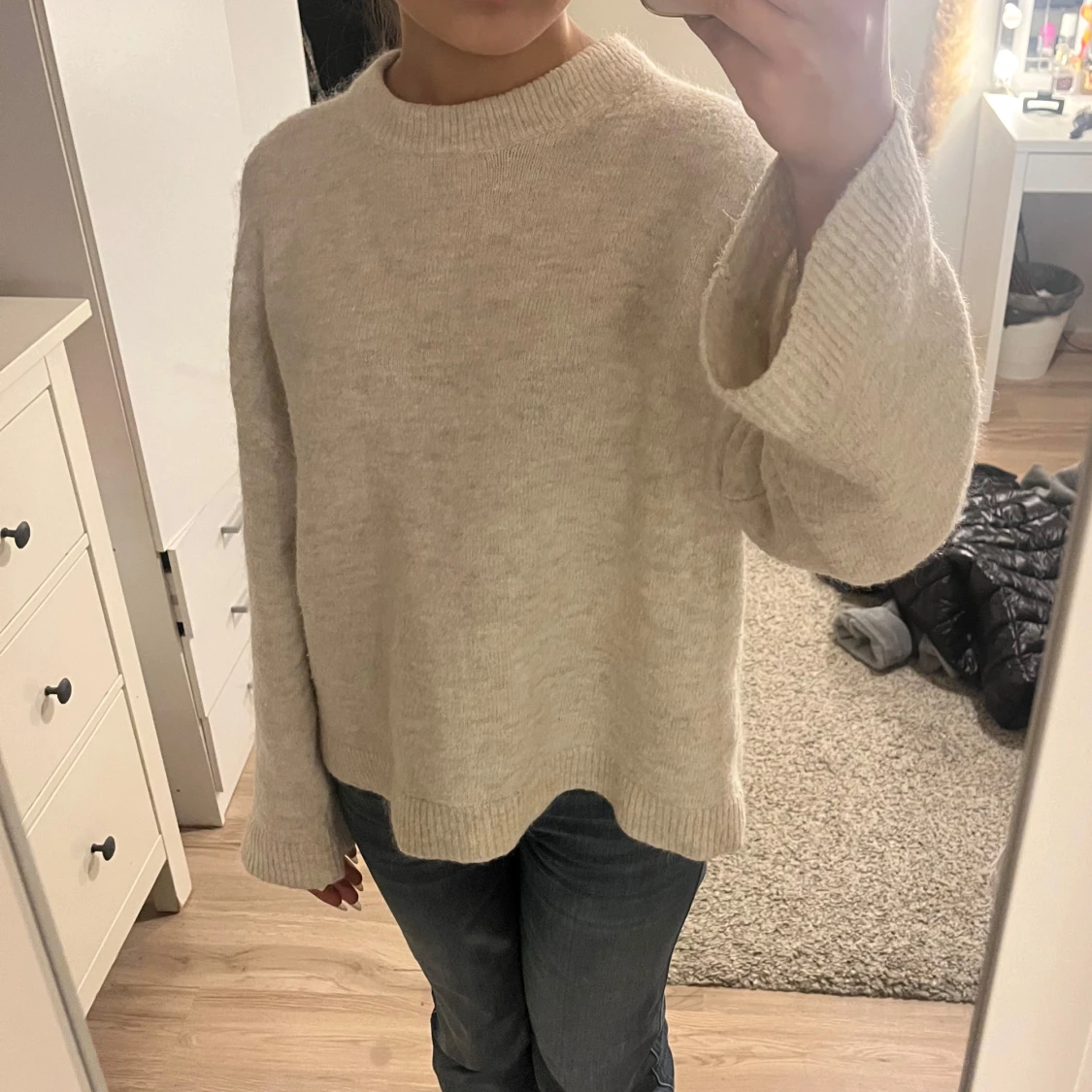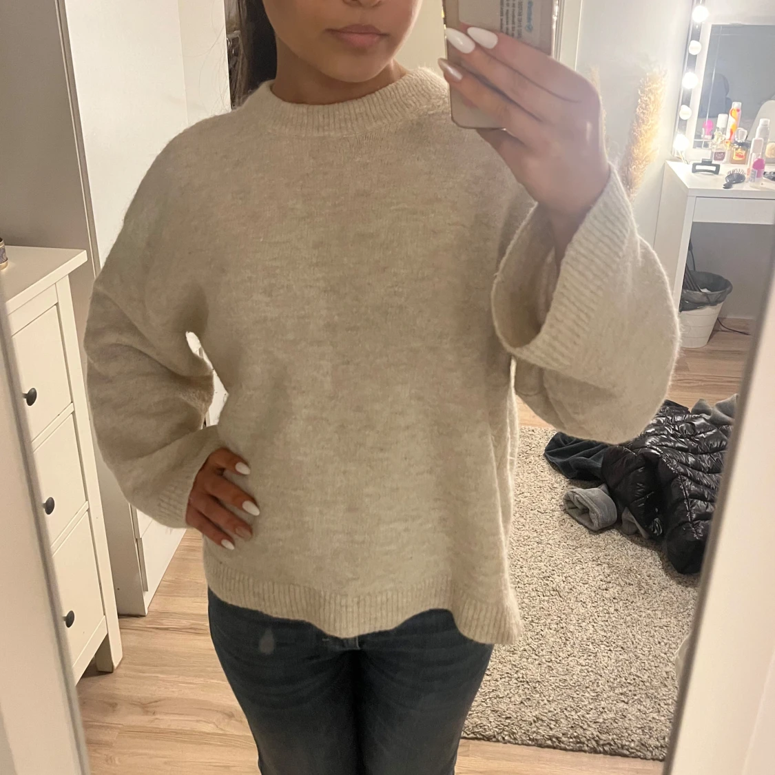 Jättemysig oversized beige stickad tröja från Ginatricot. Använd och tvättad flertal gånger men är fortfarande i gott skick, möjligtvis lite nopprig. Skriv för fler bilder. Nypris 400kr🤍