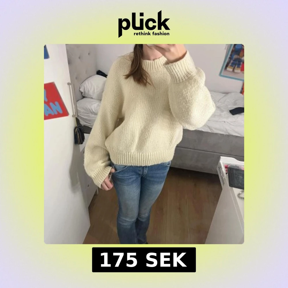 Mysig beige stickad tröja från ADPT i storlek M. Tröjan har en klassisk rund hals och långa ärmar med ribbade muddar. Perfekt för kyligare dagar.