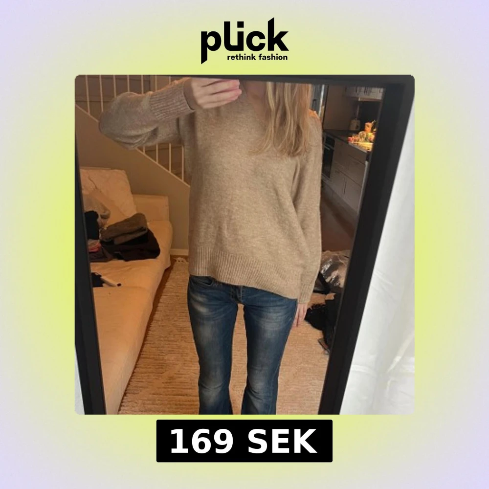 Mysig beige stickad tröja med v-ringad hals och ribbade ärmar vid ärmslut och nederkant, perfekt till hösten 🍁Enkel och stilren design som är lätt att matcha. Storlek S men passar både XS och M beroende på hur man vill att den ska sitta 🫶🏼