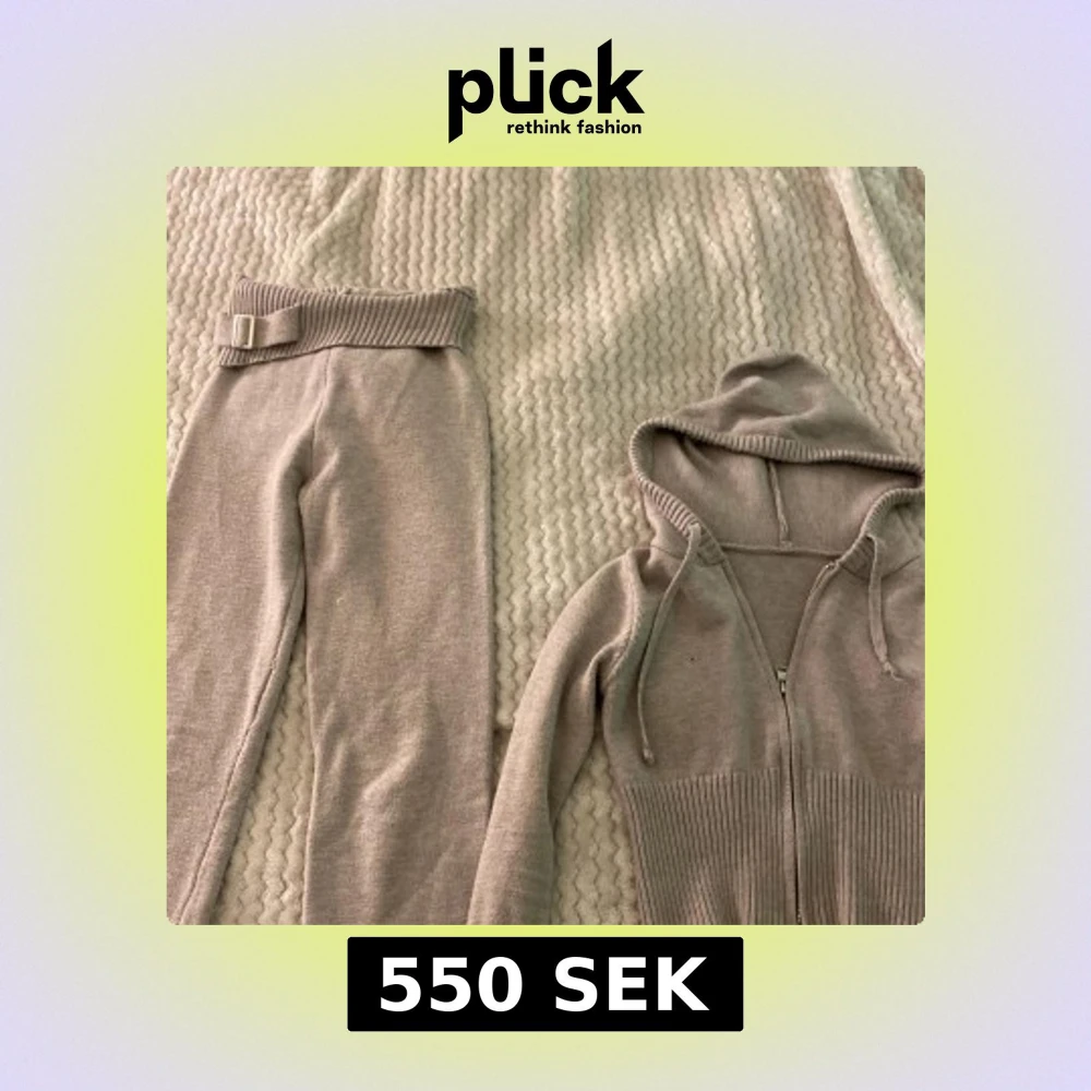 Säljer ett par beige stickade mjukisbyxor med bred ribbad midja och matchande bälte. Byxorna har en mjuk och skön känsla, perfekta för en avslappnad stil. Passar dig som gillar bekväma och trendiga plagg.