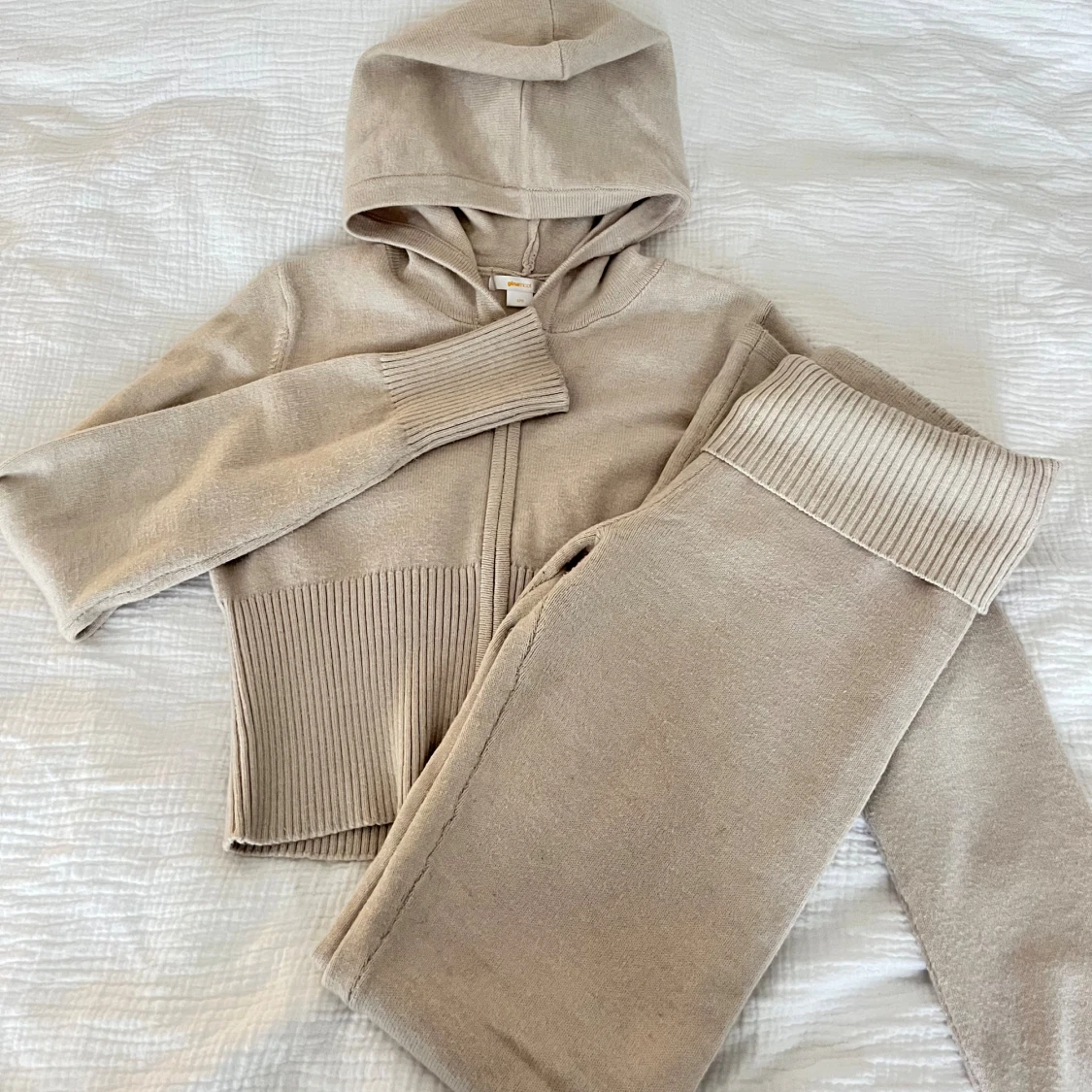 Säljer ett par beige stickade mjukisset, från Gina Tricot Young, med bred ribbad midja och raka ben. Settet är mjukt och har en skön passform, perfekta för chill dagar. Materialet är stickat och färgen är ljusbeige, vilket ger en clean och fräsch look.