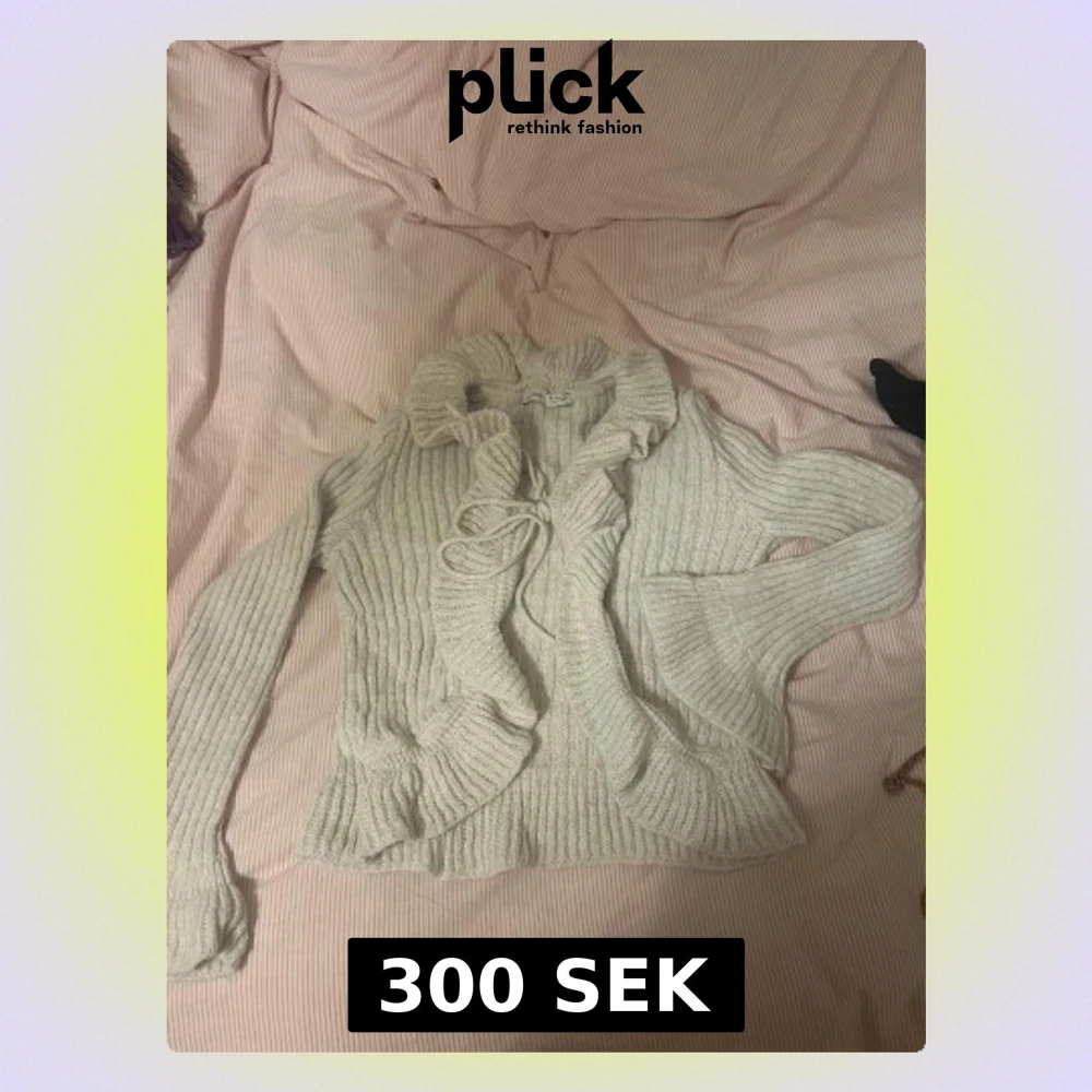 Superfin beige stickad kofta från Bershka med volangkant och knyt framtill. Koftan har långa ärmar och ribbad struktur, perfekt för lager-på-lager och en mysig vibe.