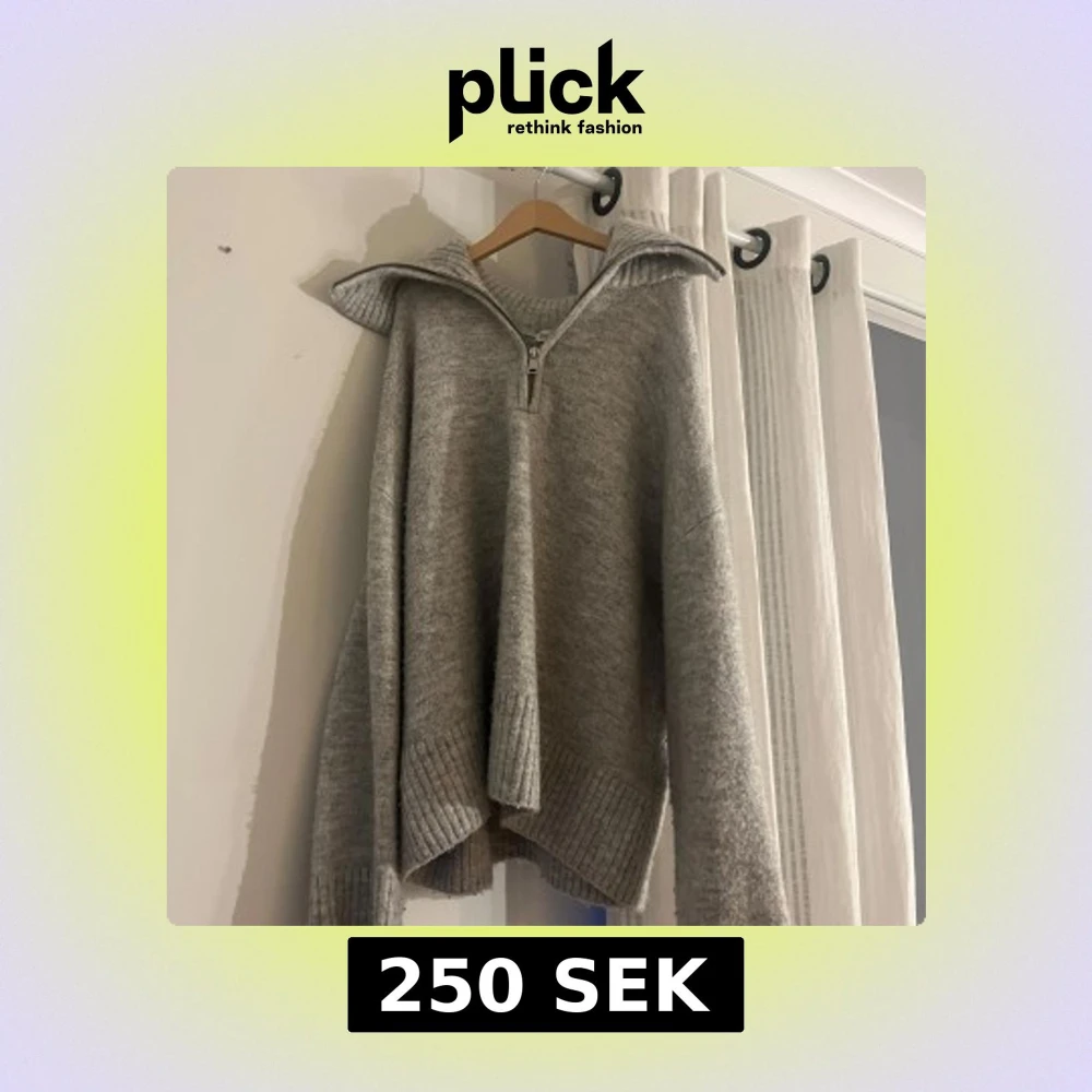 Säljer en grå stickad tröja från Bershka med dragkedja och krage. Inte använd särskilt många gånger, säljer eftersom den inte kommer till användning.