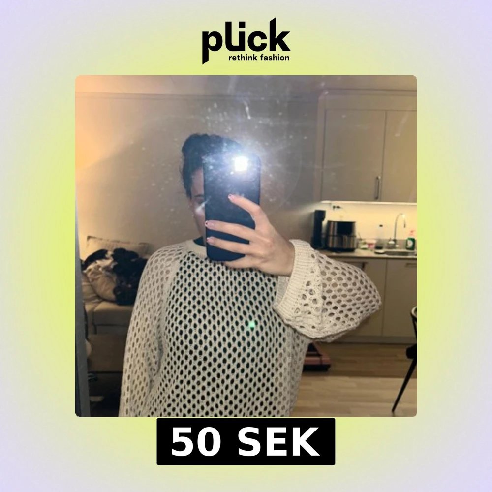 Säljer en beige stickad tröja med ett öppet nätmönster. Tröjan har långa ärmar och en avslappnad passform, perfekt för lager-på-lager-stil. Den är både trendig och bekväm, idealisk för kyligare dagar.