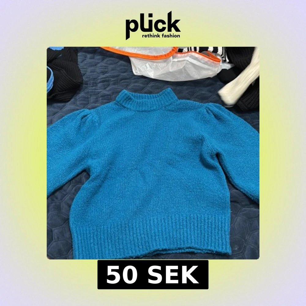 Säljer en blå stickad tröja från Bik Bok i storlek M. Tröjan har hög krage, puffiga ärmar och bred ribbad mudd vid midja och ärmslut. Perfekt för att hålla sig varm och snygg under kyliga dagar.