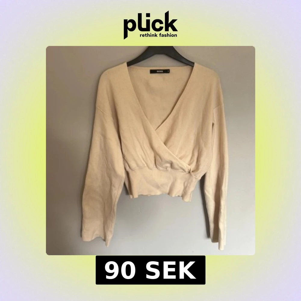 Superfin krämvit stickad tröja från BikBok med omlott och v-ringad hals. Modellen är croppad med bred resår i midjan och har långa ärmar. Perfekt för lager-på-lager och passar till både jeans och kjol. Lite hundhår på tröjan samt lite fläckigt här och var vilket gör priset lite lägre.