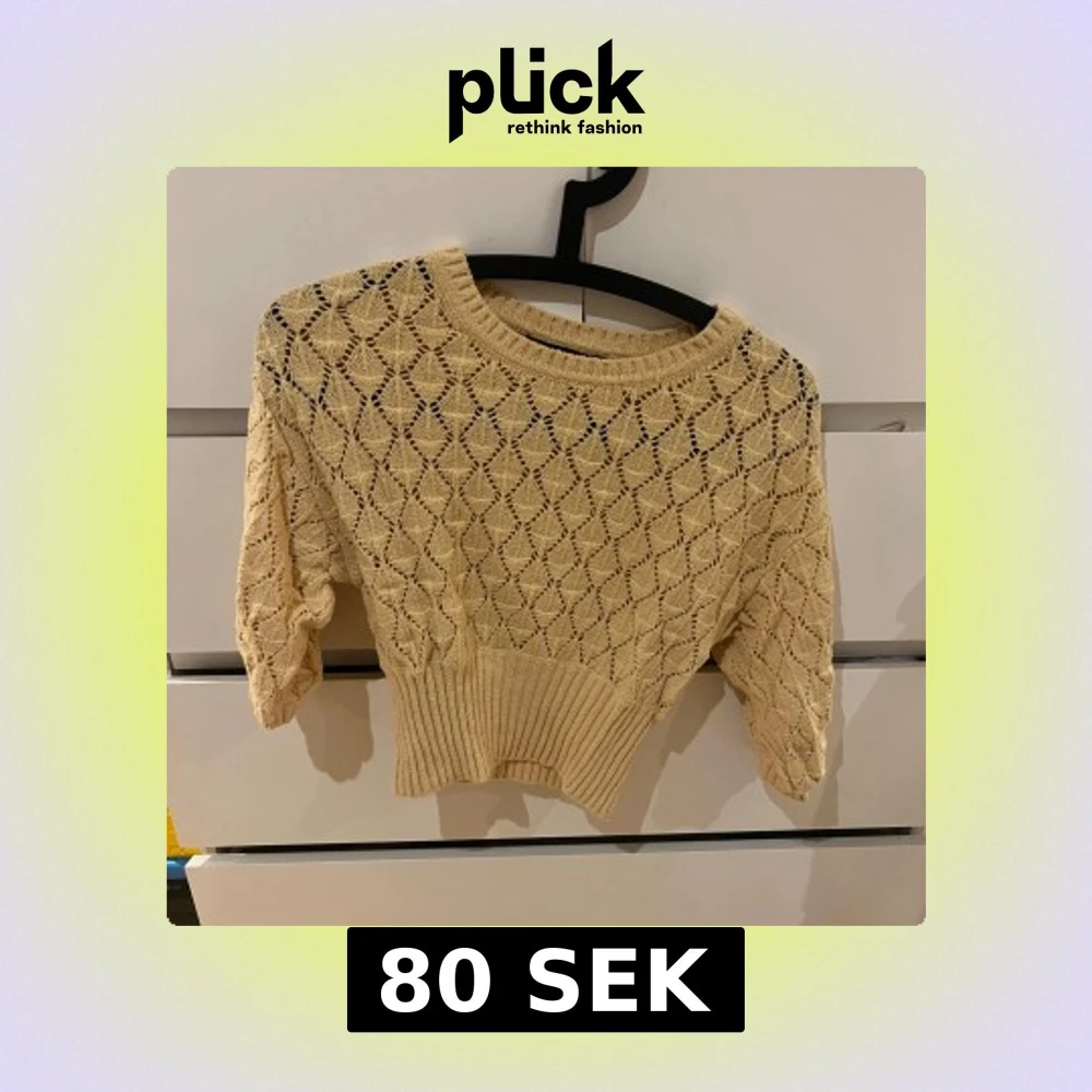 Säljer en söt gul stickad tröja från Bik Bok. Tröjan har ett fint hålmönster och är croppad med trekvartsärmar. Köpte denna för 249kr säljer den för 80+frakt.
