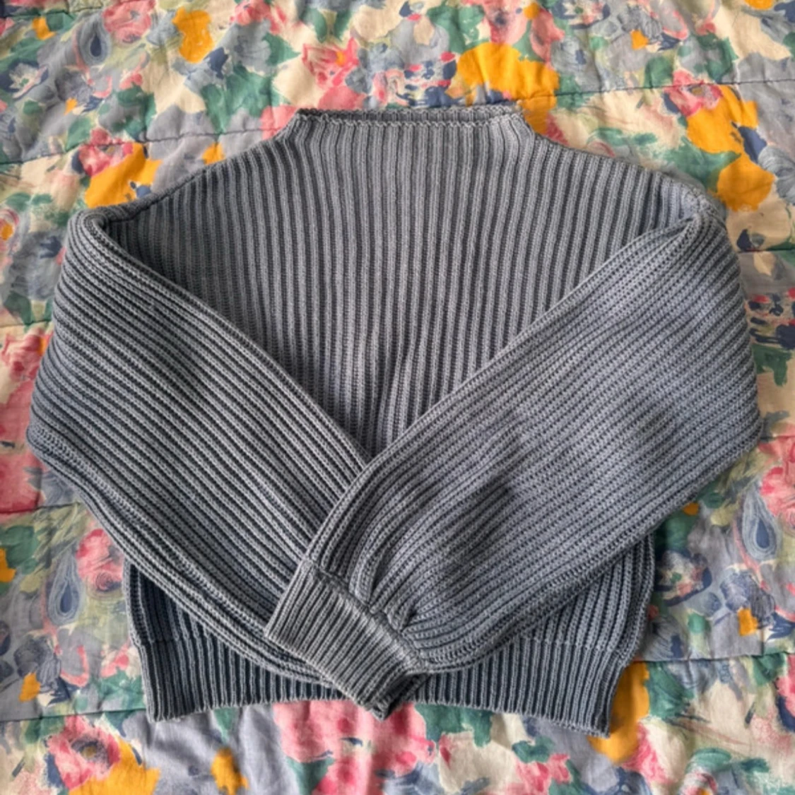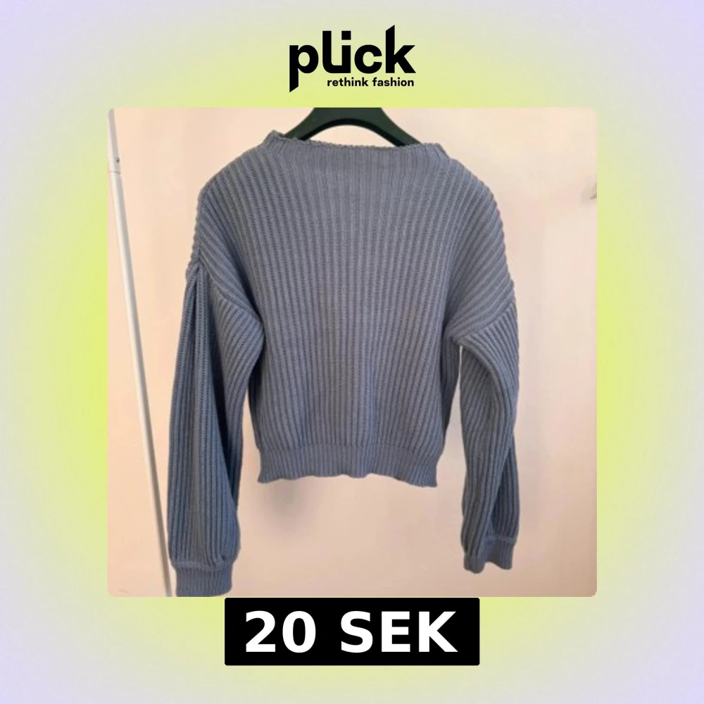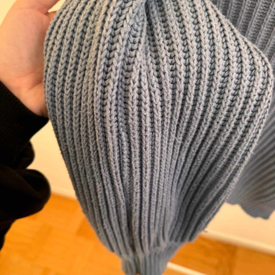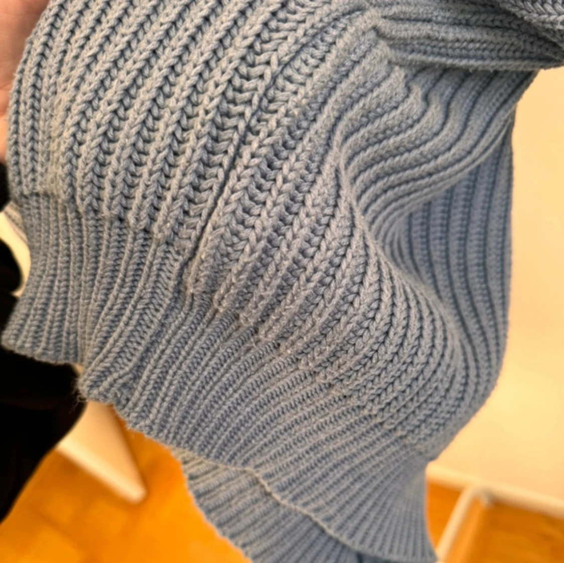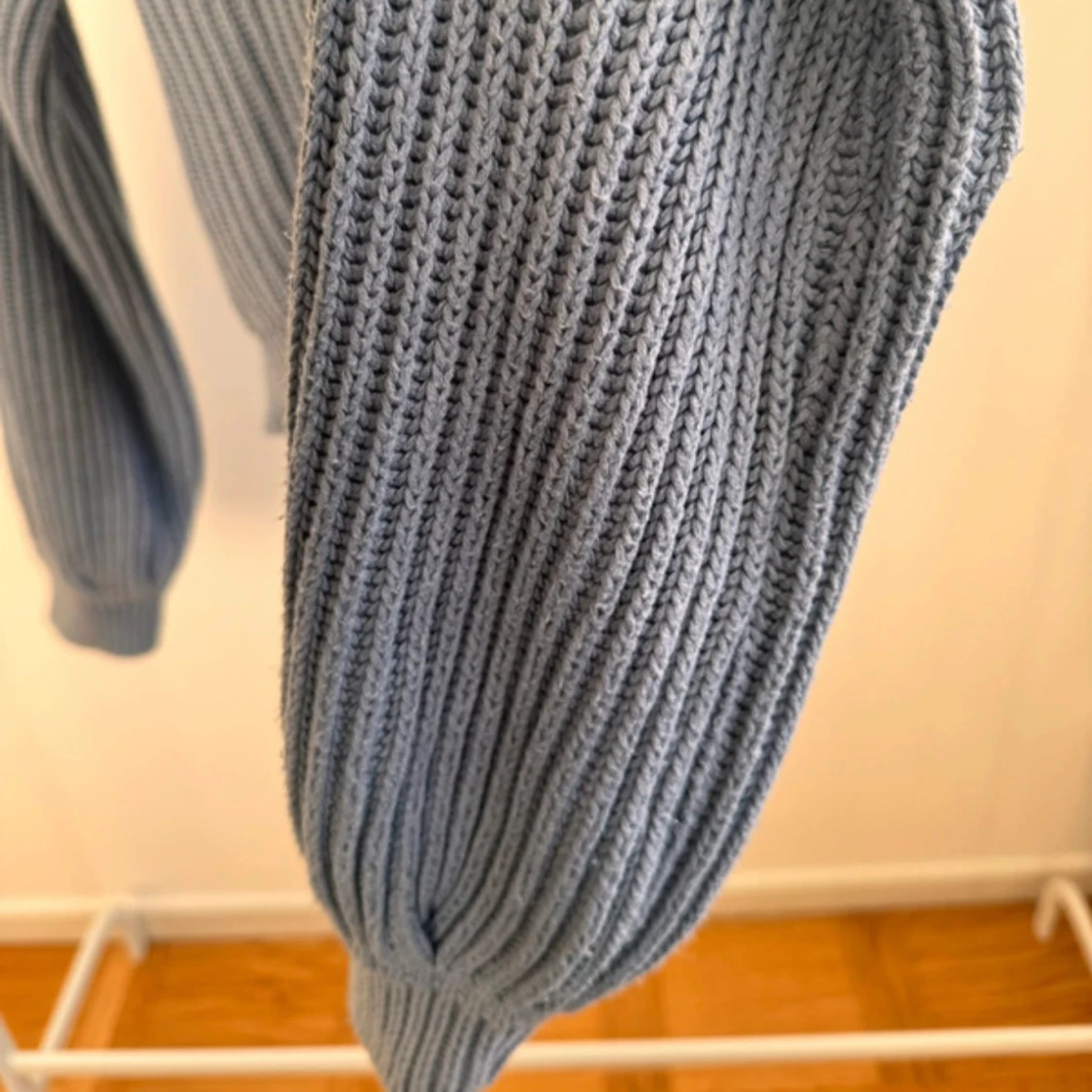 Blå stickad tröja med halvpolo och ballongärm från NAKD. Storlek XS, något oversized. Är lite nopprig på vissa ställen, se bild.