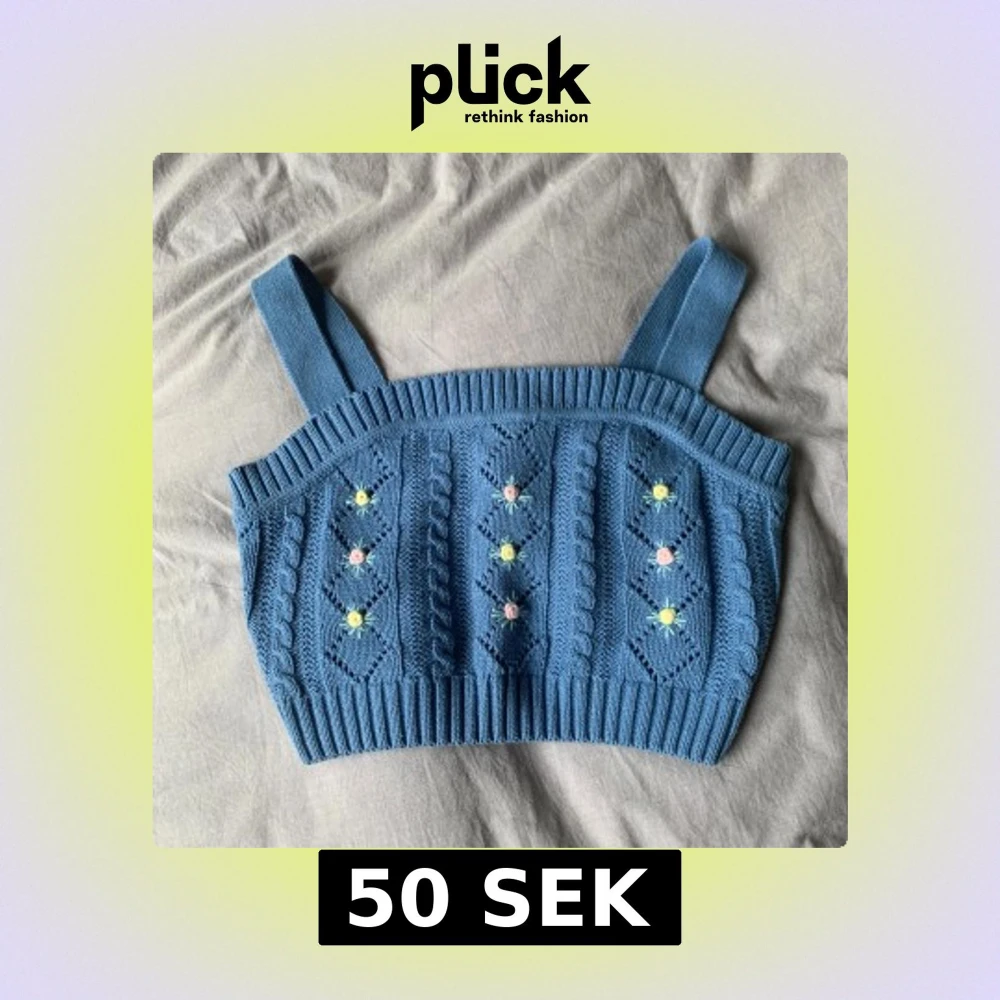 Supersöt blå stickad topp med breda axelband och små broderade blommor i pastell. Knappt använd. 🌸