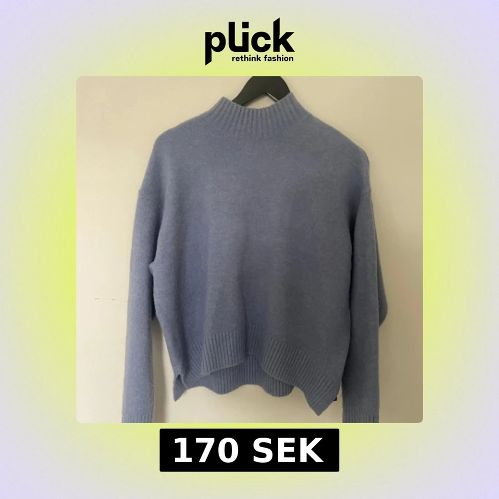 Säljer en mysig blå stickad tröja från Uniqlo. Tröjan har en lite högre krage och långa ärmar med ribbade muddar. Jättemjuk och knappt använd!