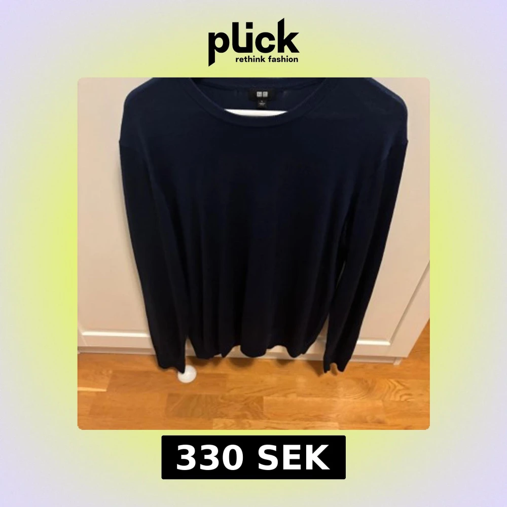 Snygg mörkblå stickad tröja från Uniqlo i storlek L men sitter bättre på M.Tillverkad i 100% ull pris är förhandlingsbart och bara skriva vid frågor eller funderingar.