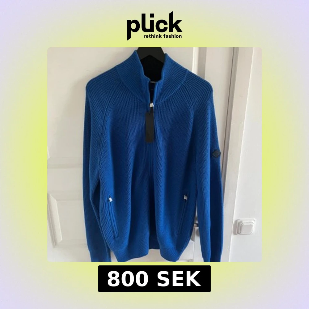 Säljer en blå stickad tröja från J.Lindeberg med dragkedja framtill och hög krage. Tröjan har långa ärmar och två fickor med dragkedja. Perfekt för kyligare dagar och snygg till jeans eller chinos. Aldrig använd innan helt ny