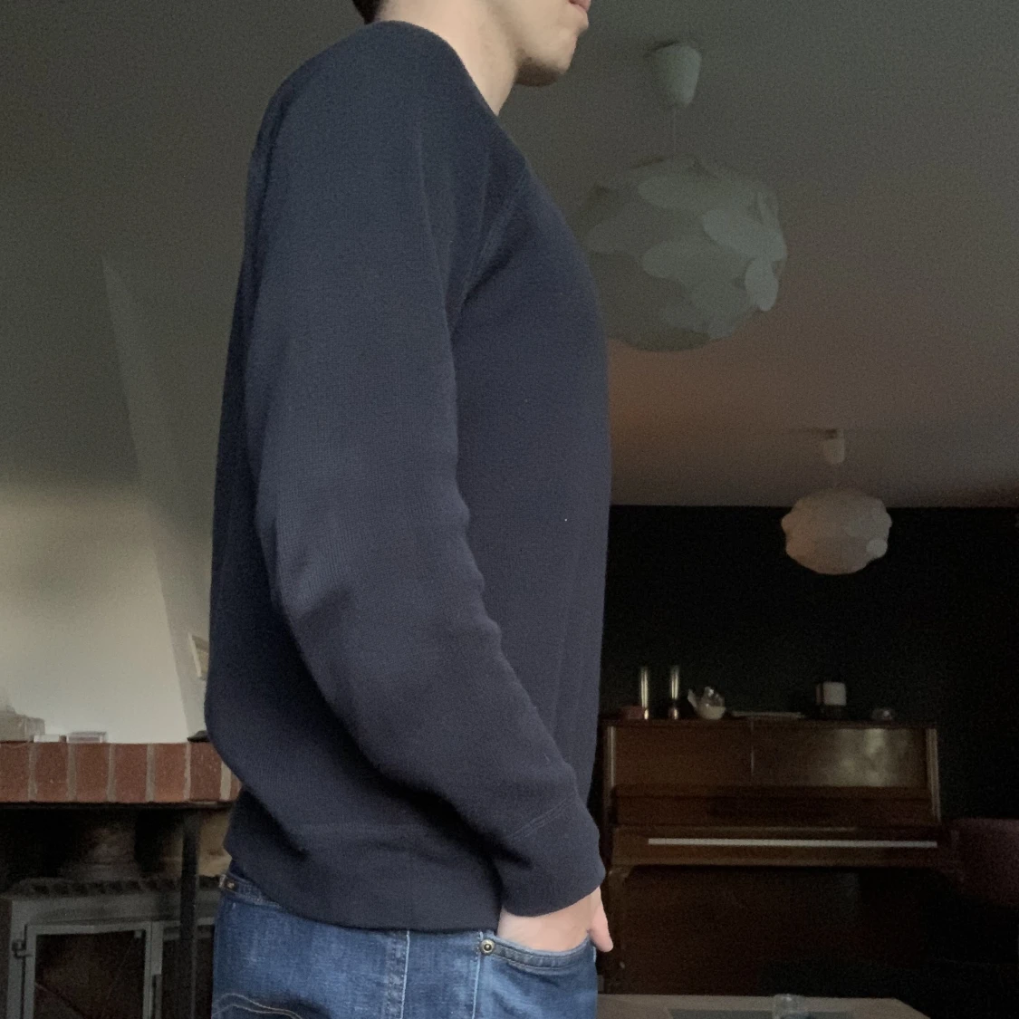 Riktigt fet stickad tröja i navy inköpt på Brothers av märket East west, modellen på bilden är ca 176 cm, ny pris= ca 600 kr mitt pris= 249 kr