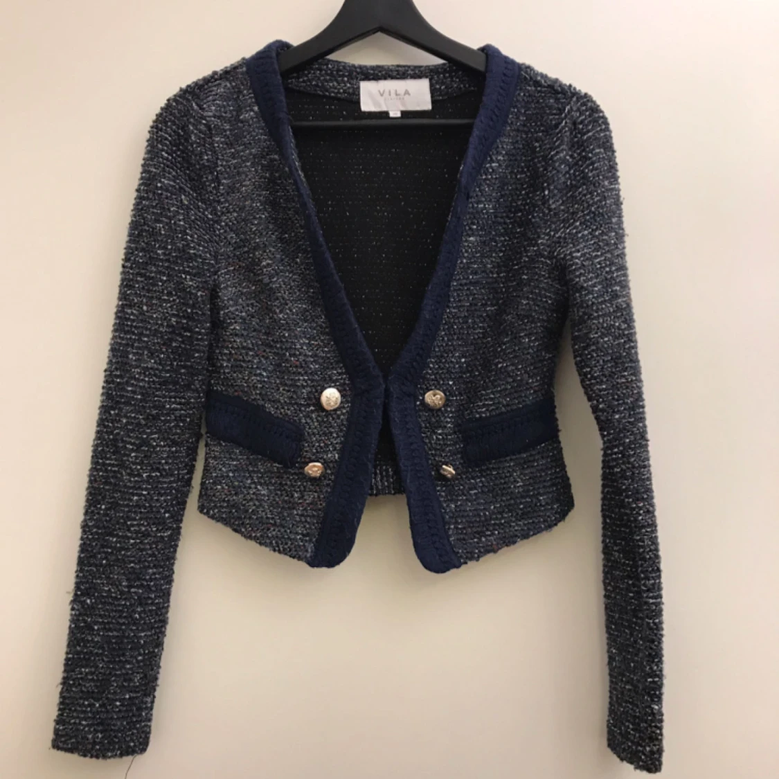 Marinblå kofta med inslag av lite andra färger i storlek XS. Koftan är kort i modellen och har fyra fina silverfärgade knappar som detalj. Den går att knäppa med ett spänne inifrån. Hämtas i Uppsala eller fraktas till önskad adress ✨