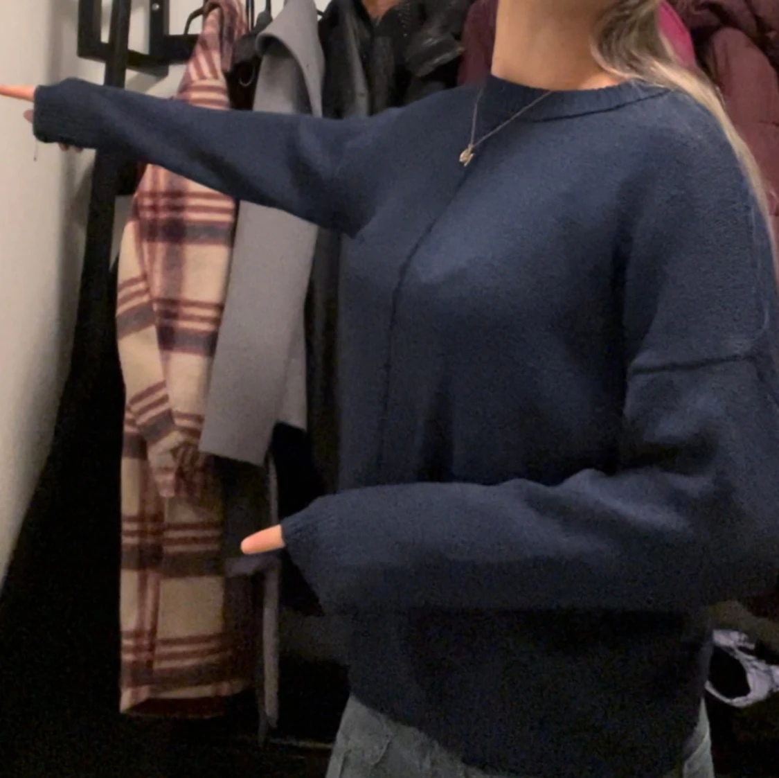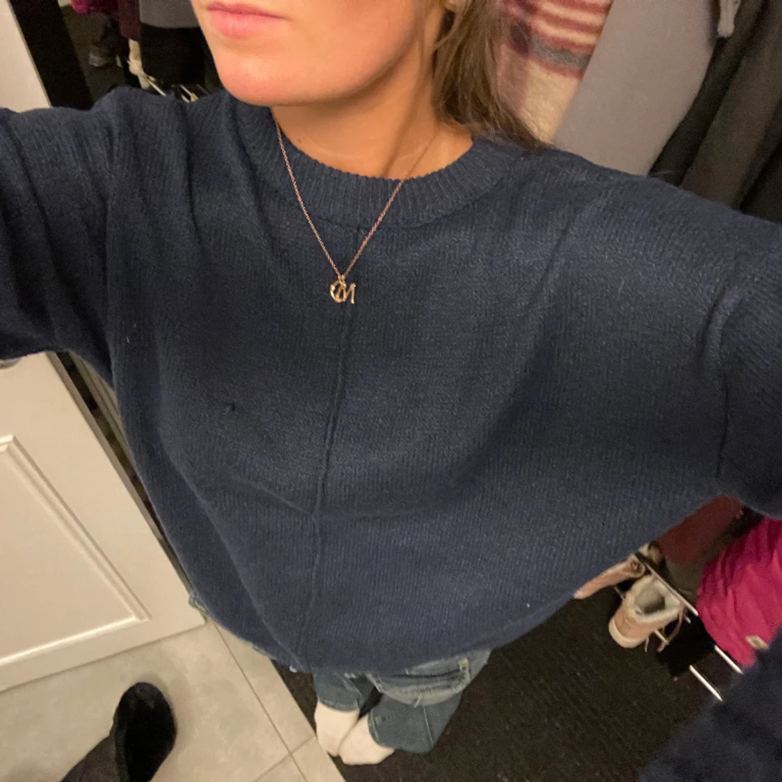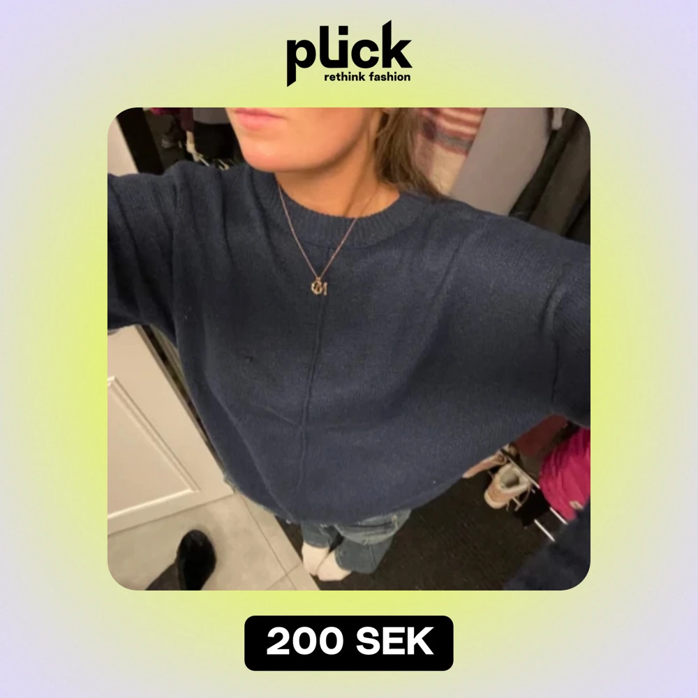 Säljer denna mörkblå stickade tröjan med ett coolt sträck på framsidan, tröjan ser helt vanlig ut bak