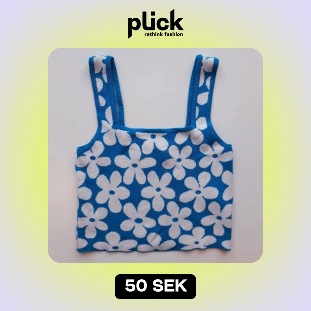 Blå topp med vita blommor. Tjockare tyg än en vanlig topp, stickat tyg. Knappt använd, mycket bra skick. Skriv vid frågor!