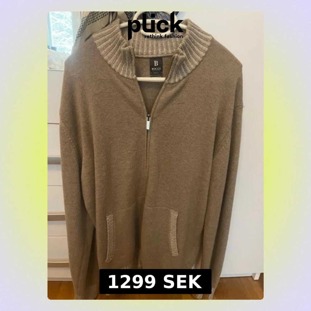 Stickad tröja i beige från Boggi med full zip. ribbad hög krage och muddar. Tröjan har två fickor framtill och är tillverkad i mjukt material, perfekt för lager på lager. Enkel och stilren design som passar till det mesta. NEVER WORN.