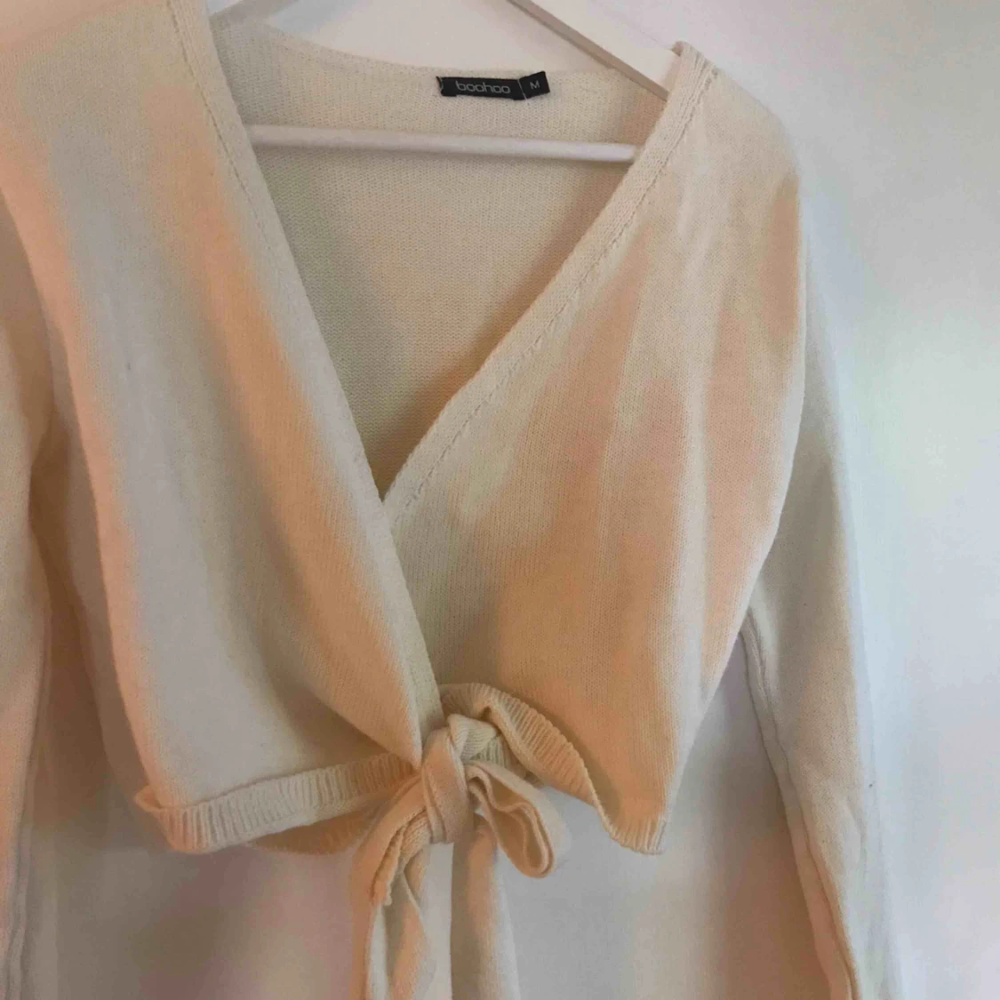 Cremevit stickad tröja med långa ärmar & knytband fram.