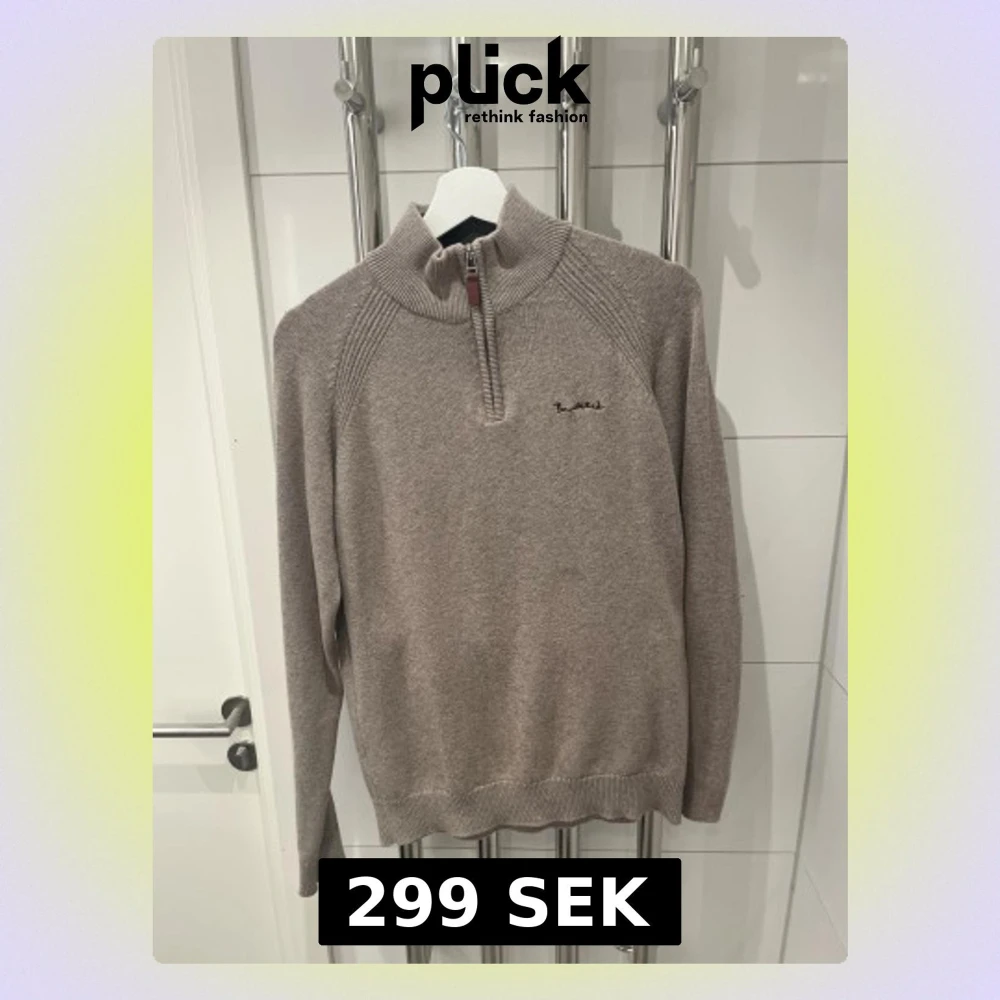 Säljer en beige stickad tröja från Barbour med half zip och hög krage. Tröjan har diskret broderad logga på bröstet och ribbade detaljer vid axlar, krage, ärmslut och nederkant. Perfekt för dig som gillar klassisk och enkel stil.