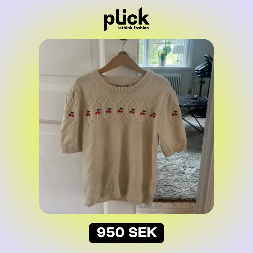 Tröjan är i färgen beige och har fina körsbär som detaljer. Den är från början köpt på Lucca. Tröjan är i mycket bra skick. Köparen står också för frakt.