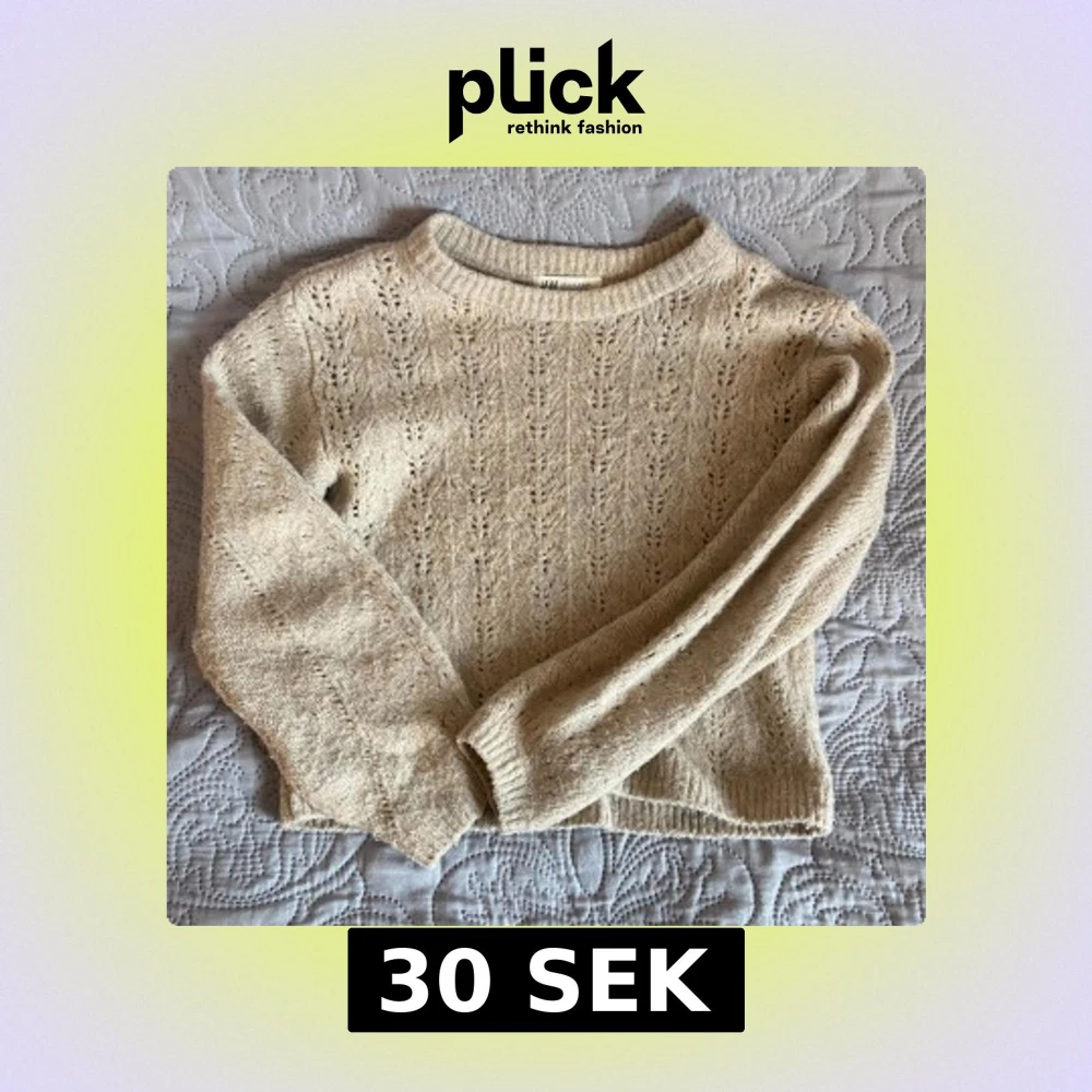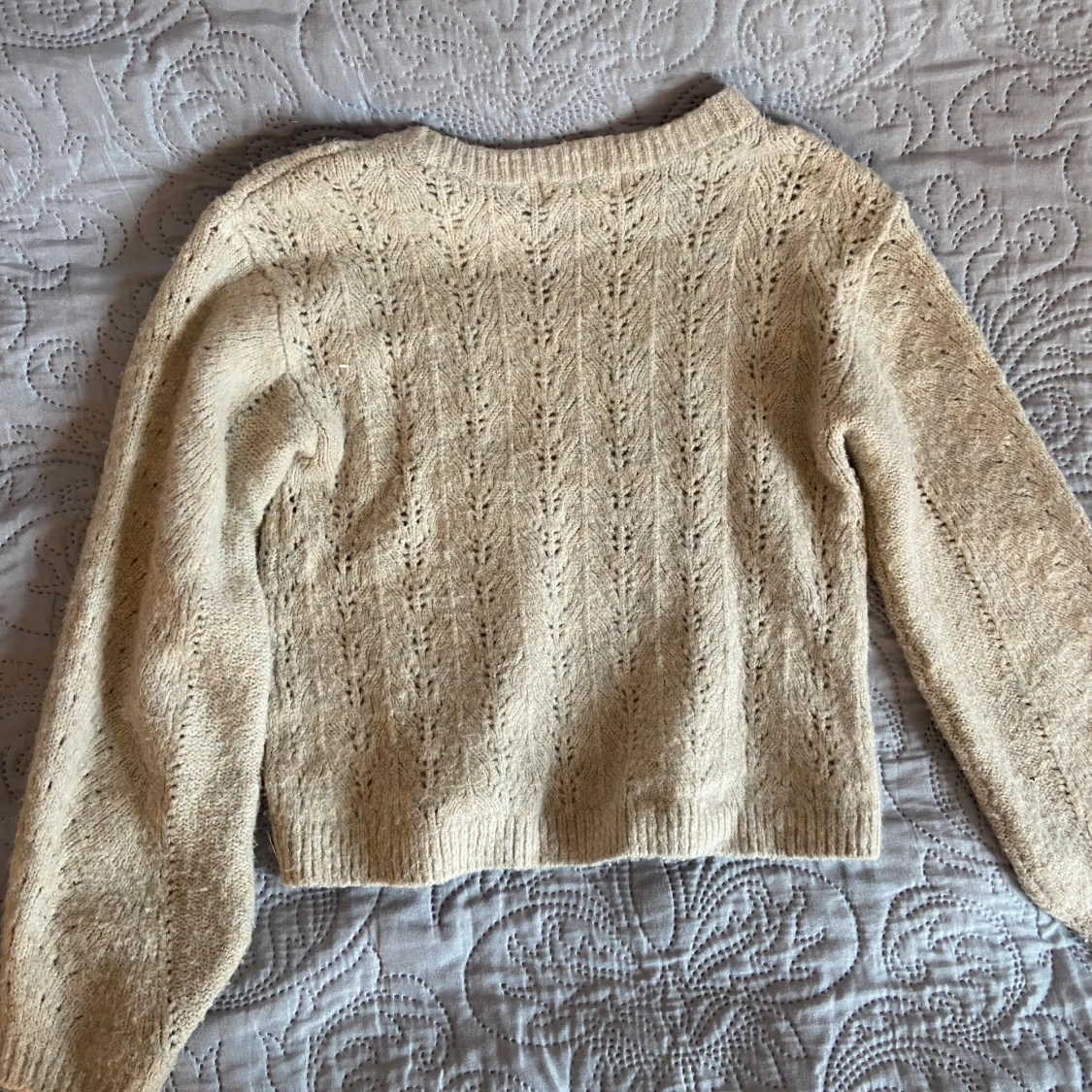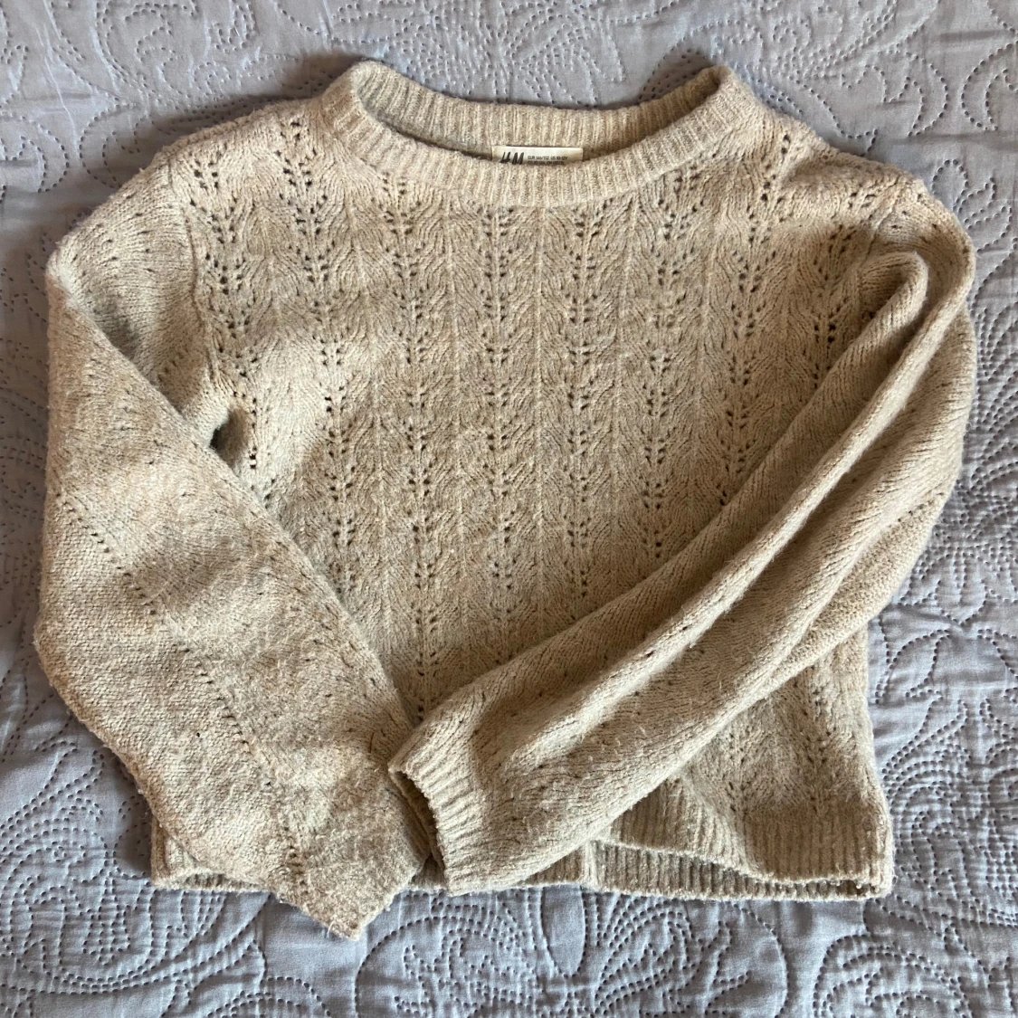 Mysig beige stickad tröja från H&M med fint hålmönster. Tröjan har rund halsringning och långa ärmar. Skulle säga att den är ganska kort! Skicka för frågor💓💓💓💓 storleken är 146/152 men passar på mig som har xs/s men den blir kortare då!
