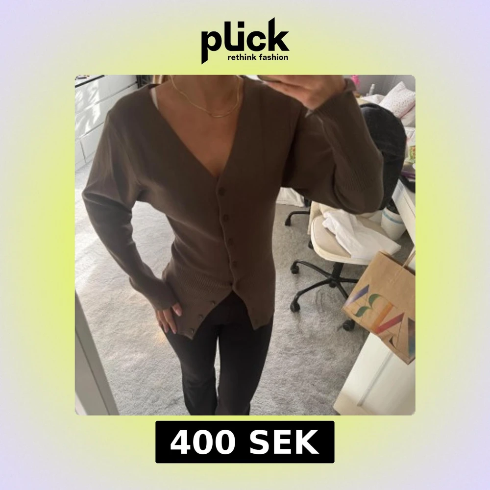 Säljer en brun kofta med v-ringning och knappar framtill. Tröjan har lång ärm och är ribbad vid ärmslut och nederkant. Så bra passform och mycket bra skick!