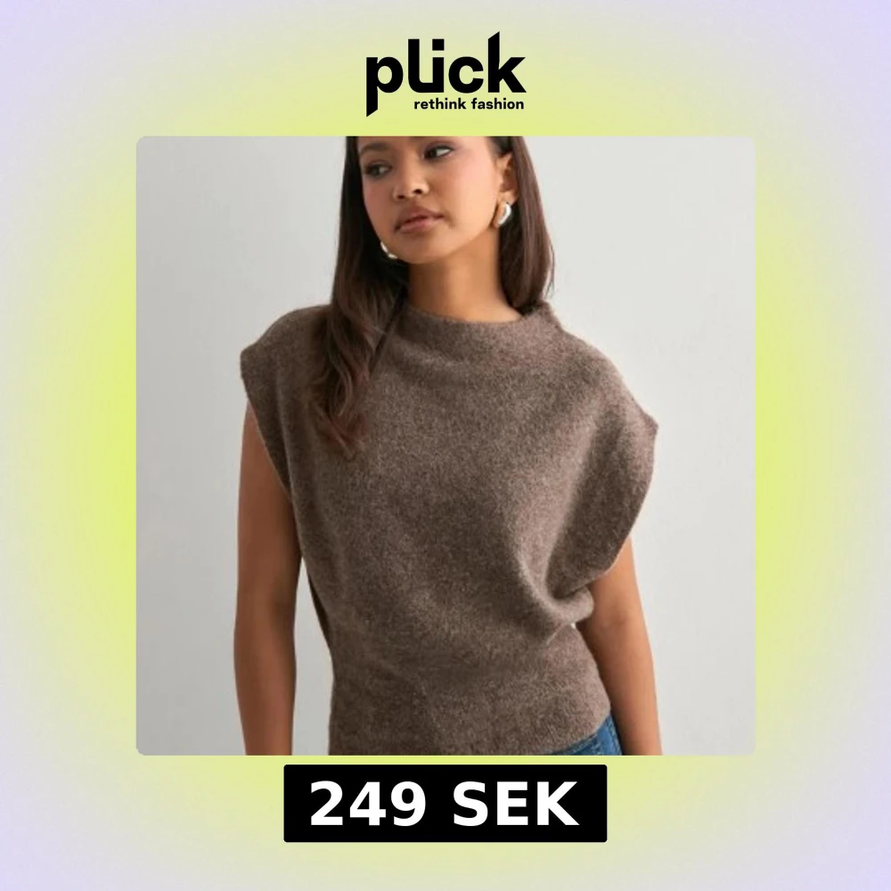 Säljer en brun stickad topp med mjuk och lite fluffig känsla. Modellen är ärmlös med breda axlar och har en avslappnad passform som sitter snyggt vid midjan. Slutsåld överallt💕