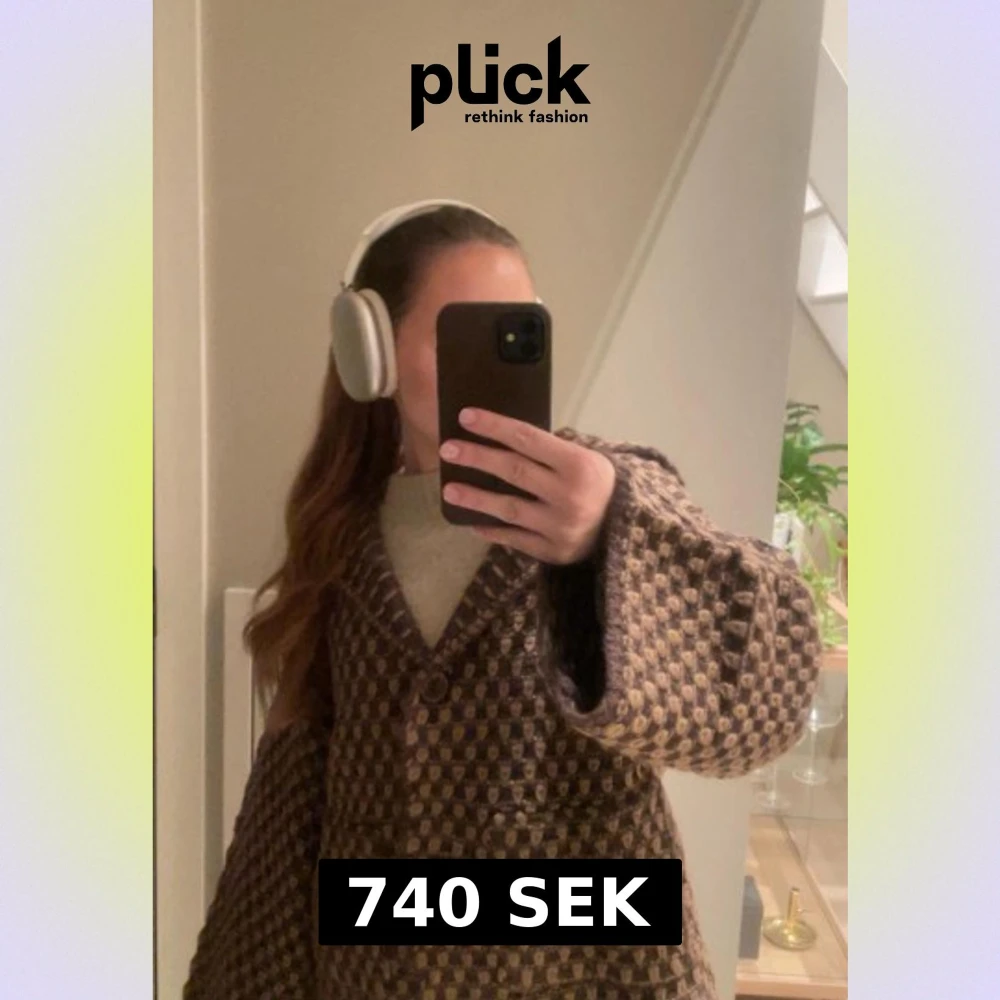 Säljer en brun och beige rutig kofta med stora knappar och bred krage. Koftan har vida, långa ärmar och ett stickat, mjukt material som känns riktigt cozy. Perfekt för lager-på-lager och snygg till jeans eller kjol.