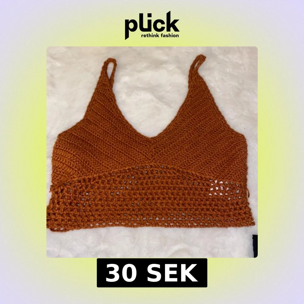 Säljer en brun/orange stickad linnetopp med smala axelband och v-ringad design. Toppen har ett luftigt mönster nedtill som ger en snygg look. Perfekt för varma dagar!