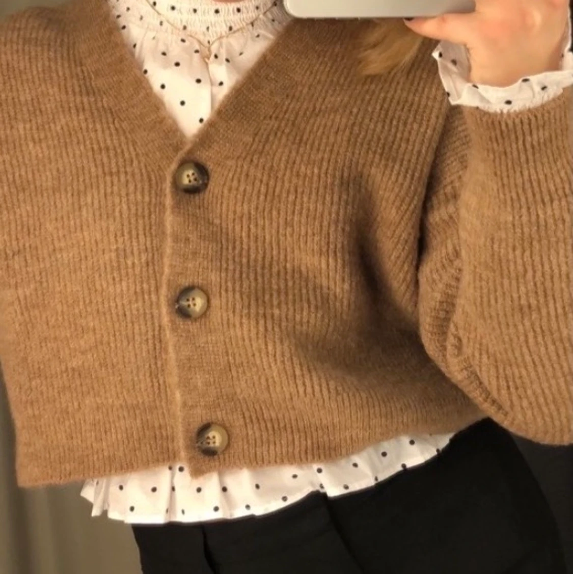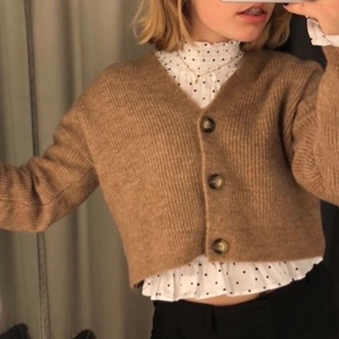 Stickad brun kofta från Bikbok. Jag är vanligtvis storlek S men XS passarsuperbra! Tyget är ganska elastiskt så det passar nog en mindre M också 💕💕💕