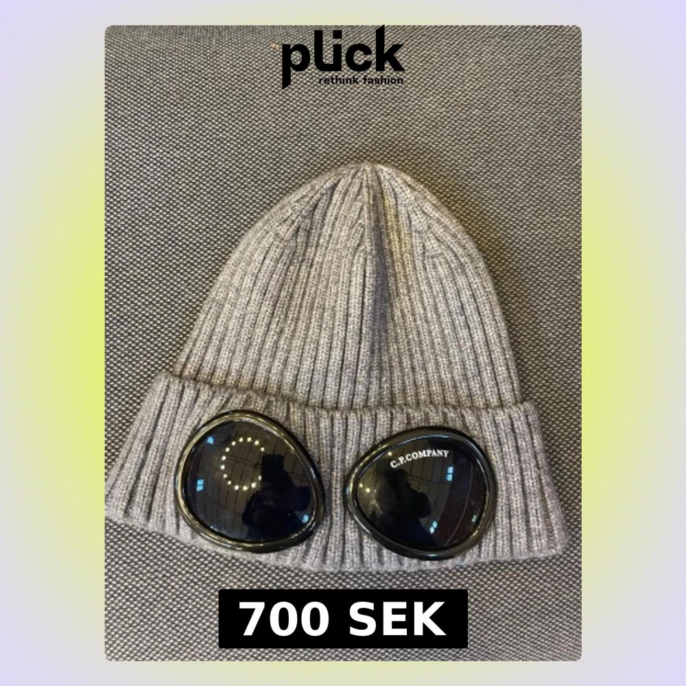Säljer en grå ribbstickad mössa från C.P. Company med ikoniska svarta goggle-linser framtill. Mössan är tillverkad i mjuk ull och har en uppvikt kant. Perfekt för dig som vill sticka ut med streetwear-vibe och snygga detaljer.