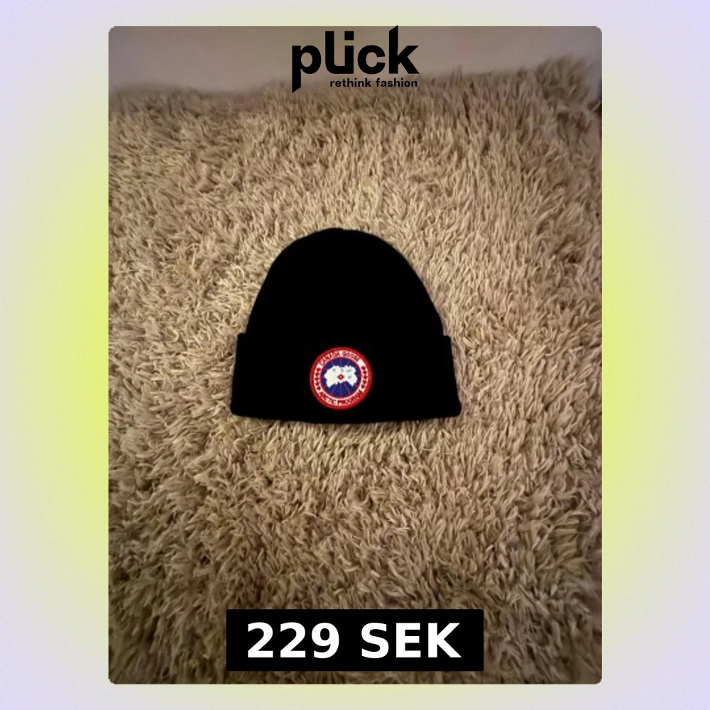 Svart mössa från Canada Goose med klassisk rund logotyp framtill i rött, vitt och blått. Enkel och stilren design med uppvikt kant. Perfekt för kalla dagar och snygg till streetwear. Materialet är mjukt och värmande, troligen stickad.