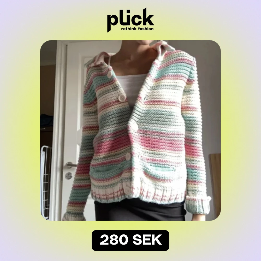 Jättefin pastell färgglad randig virkad cardigan med söta vita knappar på framsidan. Säljer denna då jag köpte en annan, så Nyttskick!💗