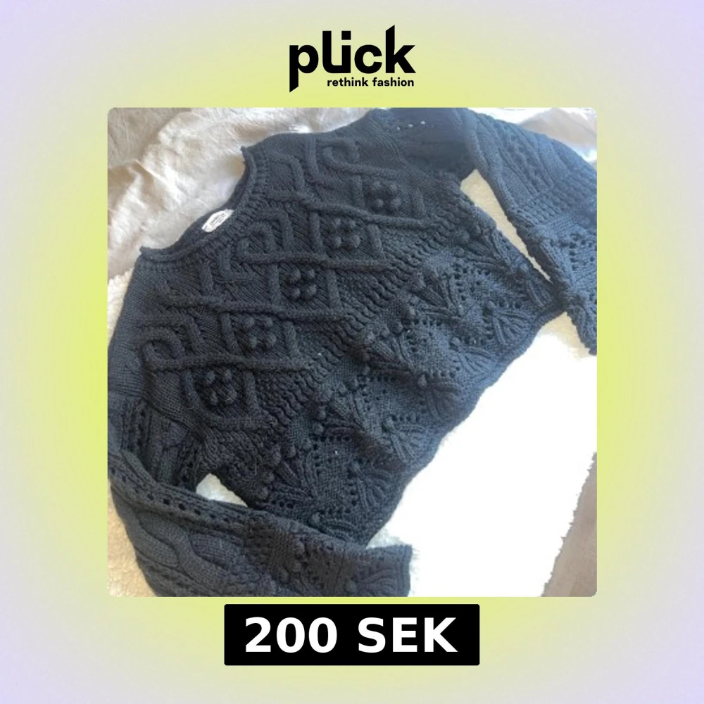 Säljer en svart stickad tröja med ett unikt mönster. Tröjan har långa ärmar och en croppad passform som ger en trendig look. Endast använd en gång. Köpt på chiquelle i str M/L. Nypris 599kr