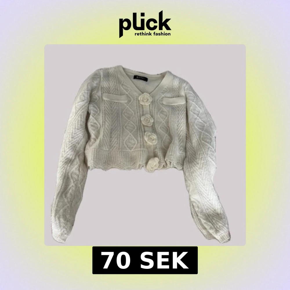 Supersöt vit stickad kofta från BMBD med unika virkade blommor som knappar. Koftan är croppad, har lång ärm och snyggt mönster i stickningen. Perfekt för lager-på-lager och ger en gullig touch till din outfit.