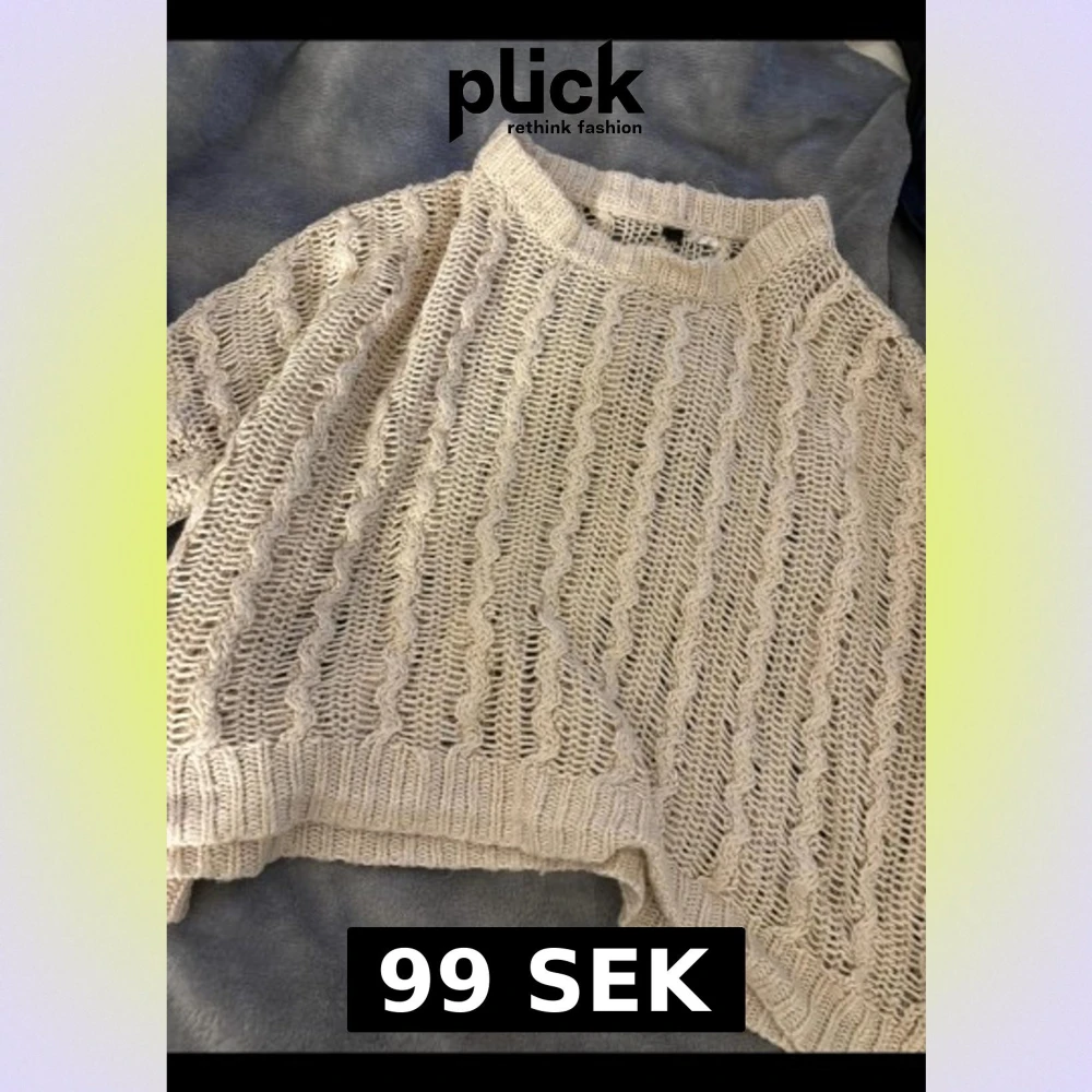 Säljer en beige stickad tröja från H&M med grovt kabelmönster och luftig struktur. Tröjan har långärmade ärmar, ribbad hals och muddar. Perfekt för lager-på-lager och chill stil. Passar dig som gillar en loose fit och mysiga vibes. den är croptop alltså kort på, och man har den över en tröja