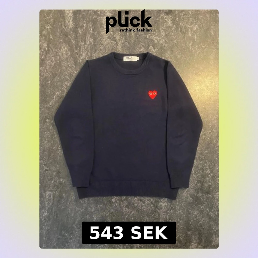 (Priset går att diskuteras) Mörkblå stickad tröja från Comme des Garçons PLAY med det ikoniska röda hjärtat broderat på bröstet. Perfekt för dig som gillar stilrena plagg med en twist.