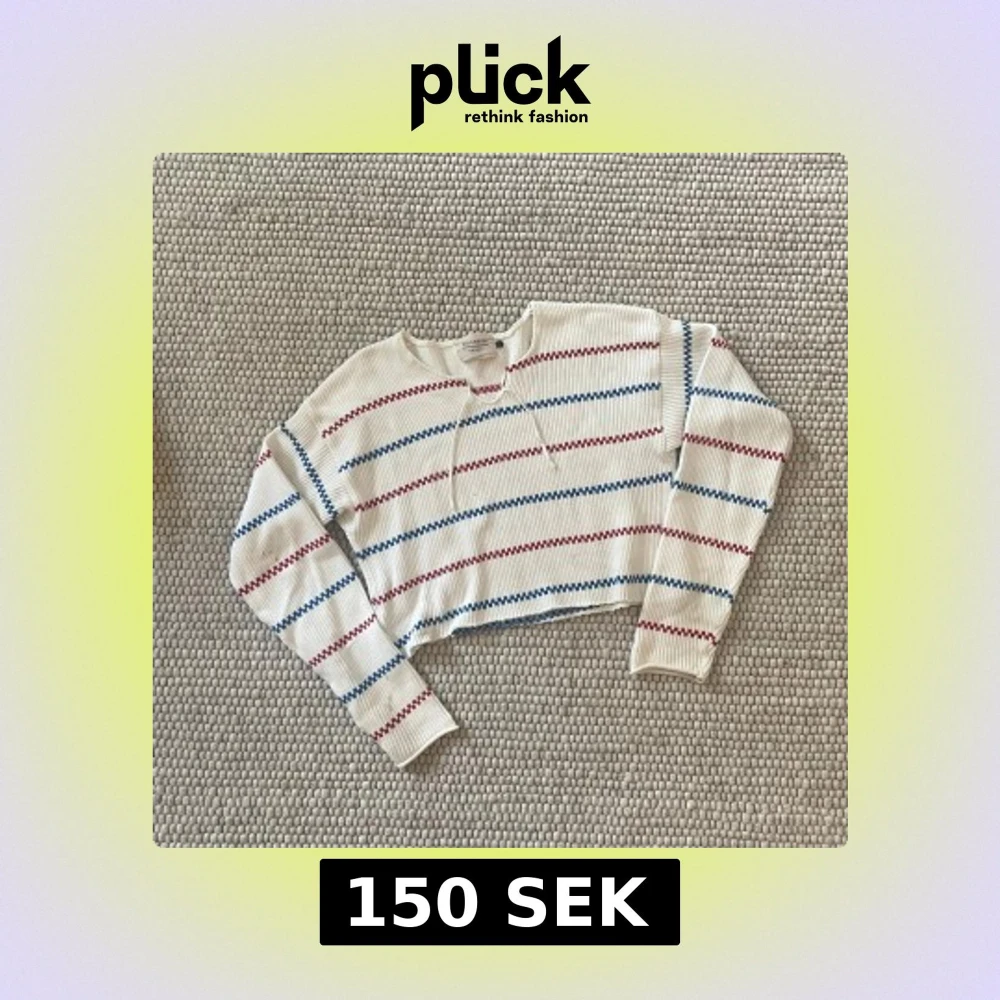 En stickad tröja med röda och blå ränder ❤️ riktigt somrig och fin 💕avklippt så den är lite croppad 🫶🏻små fläckar på höger ärm och en liten fläck på framsidan, se bild