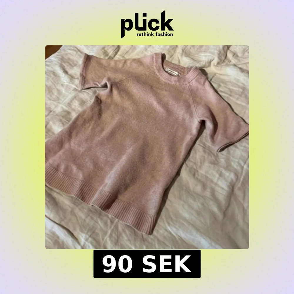 Säljer en ljusrosa stickad tröja i lammullsmix med korta ärmar och ribbade kanter vid hals, ärmslut och nederkant. Perfekt för lager-på-lager och passar till många olika stilar.