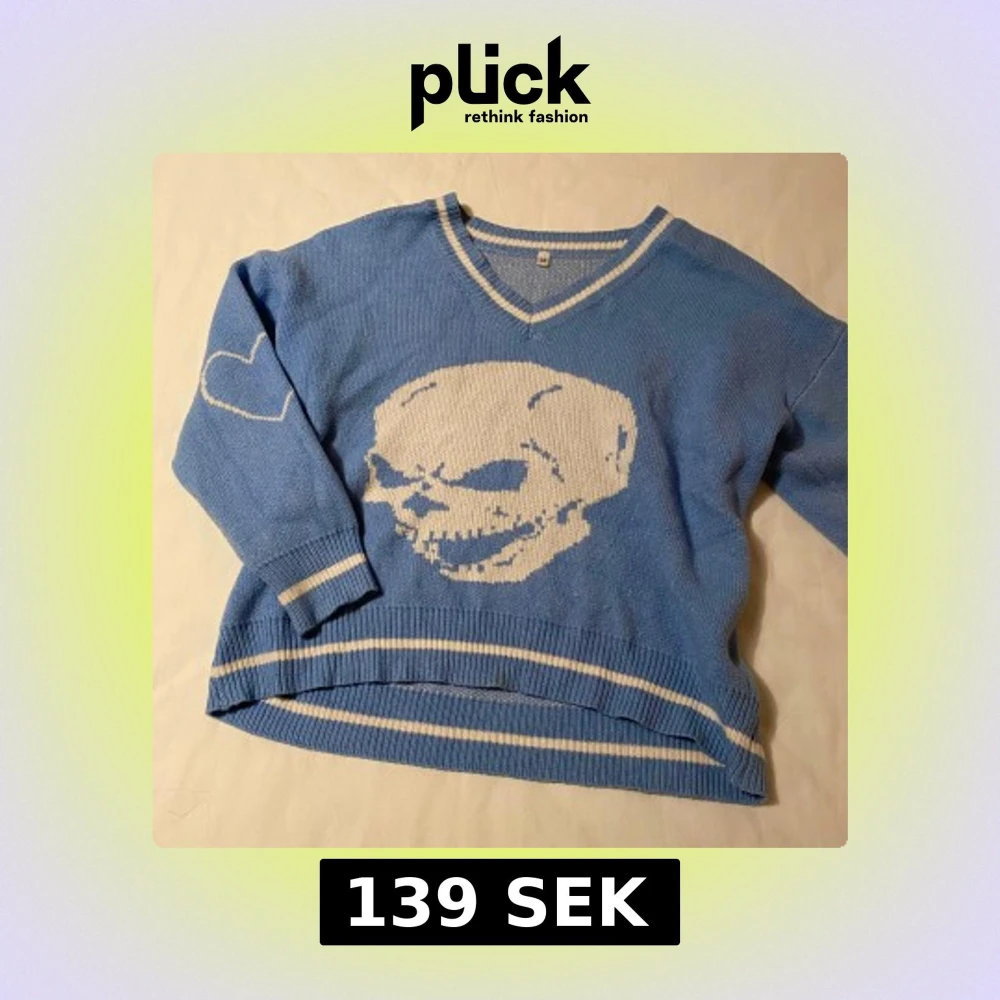 Säljer en blå stickad tröja med döskalle på framsidan och hjärtdetalj på ärmen. Hör av dig om du undrar något🩷