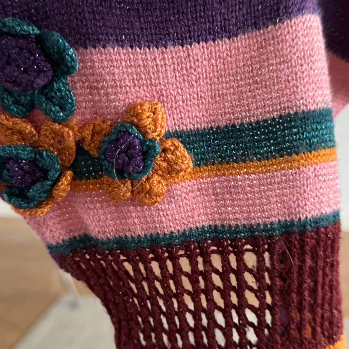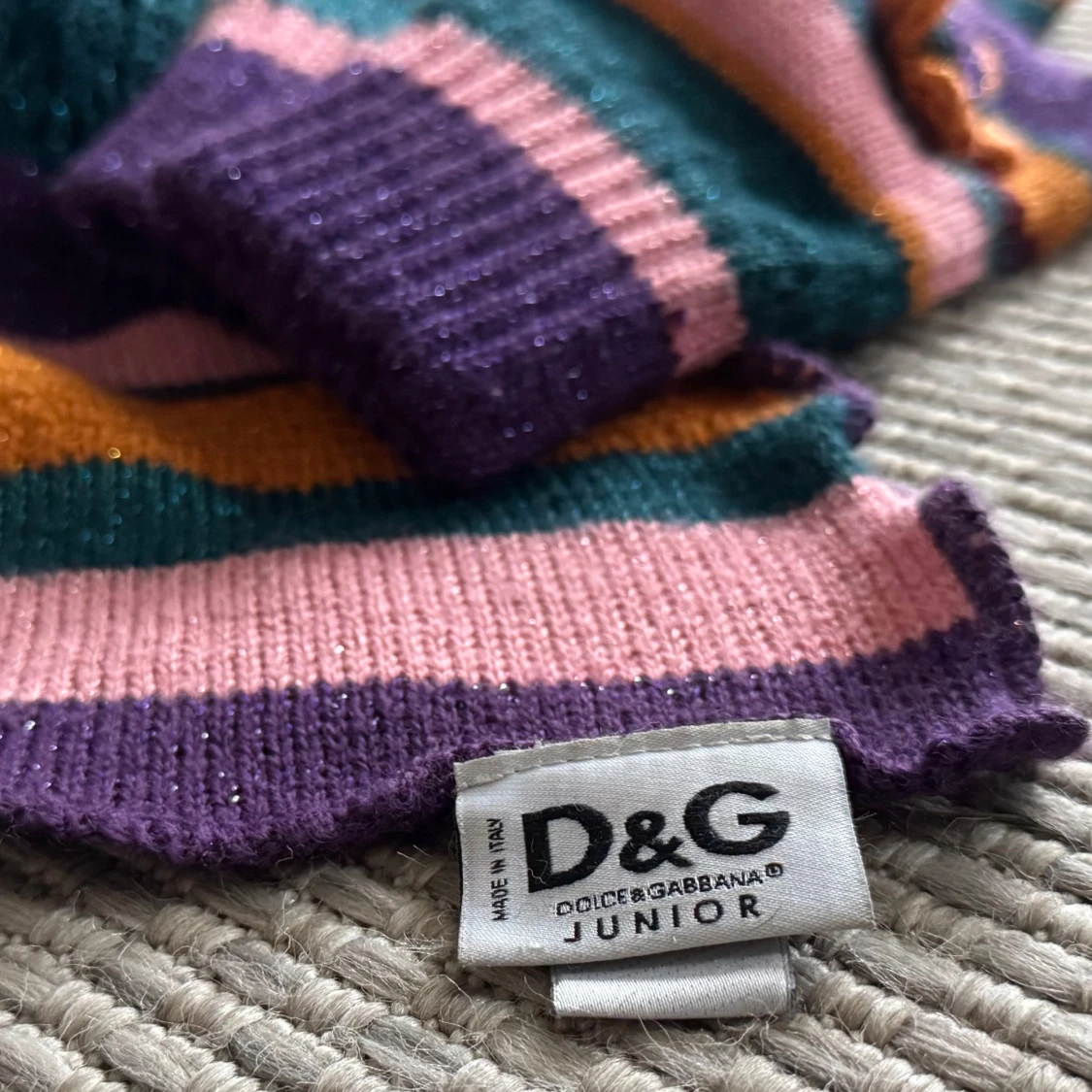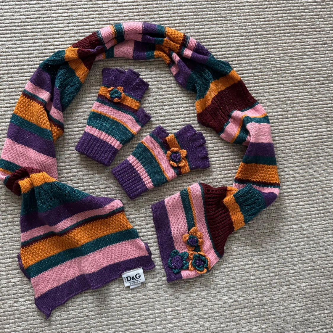 Säljer en färgglad randig halsduk från Dolce & Gabbana Junior. Halsduken har ränder i lila, rosa, orange och grön med glittriga detaljer och blommiga applikationer. Original, inköpt i Italien, mycket begränsat använda. 1650kr för båda.