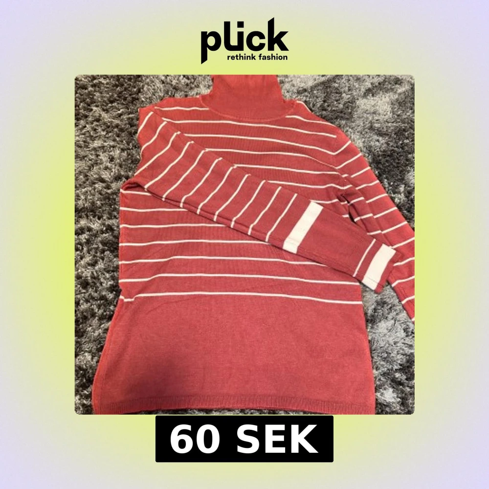 Säljer en röd tröja med vita horisontella ränder. Tröjan har lång ärm och är stickad i mjukt material. Klassisk passform med ribbade muddar och hög polokrage. Perfekt för lager-på-lager under kyliga dagar. Aldrig används.
