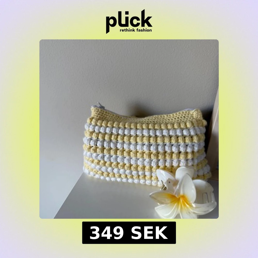 Söt handgjord necessär i gult och vitt med virkade ränder och bubblig struktur. Perfekt för småsaker eller smink.