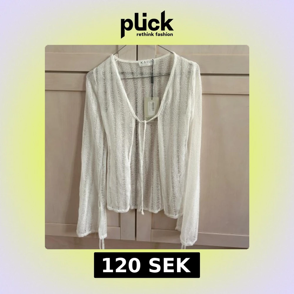 Säljer en vit, transparent och lätt stickad blus/kofta från Kaiia. Blusen har långa ärmar, v-ringning och knyt framtill. Även Snygg detalj med knytband vid ärmslut.