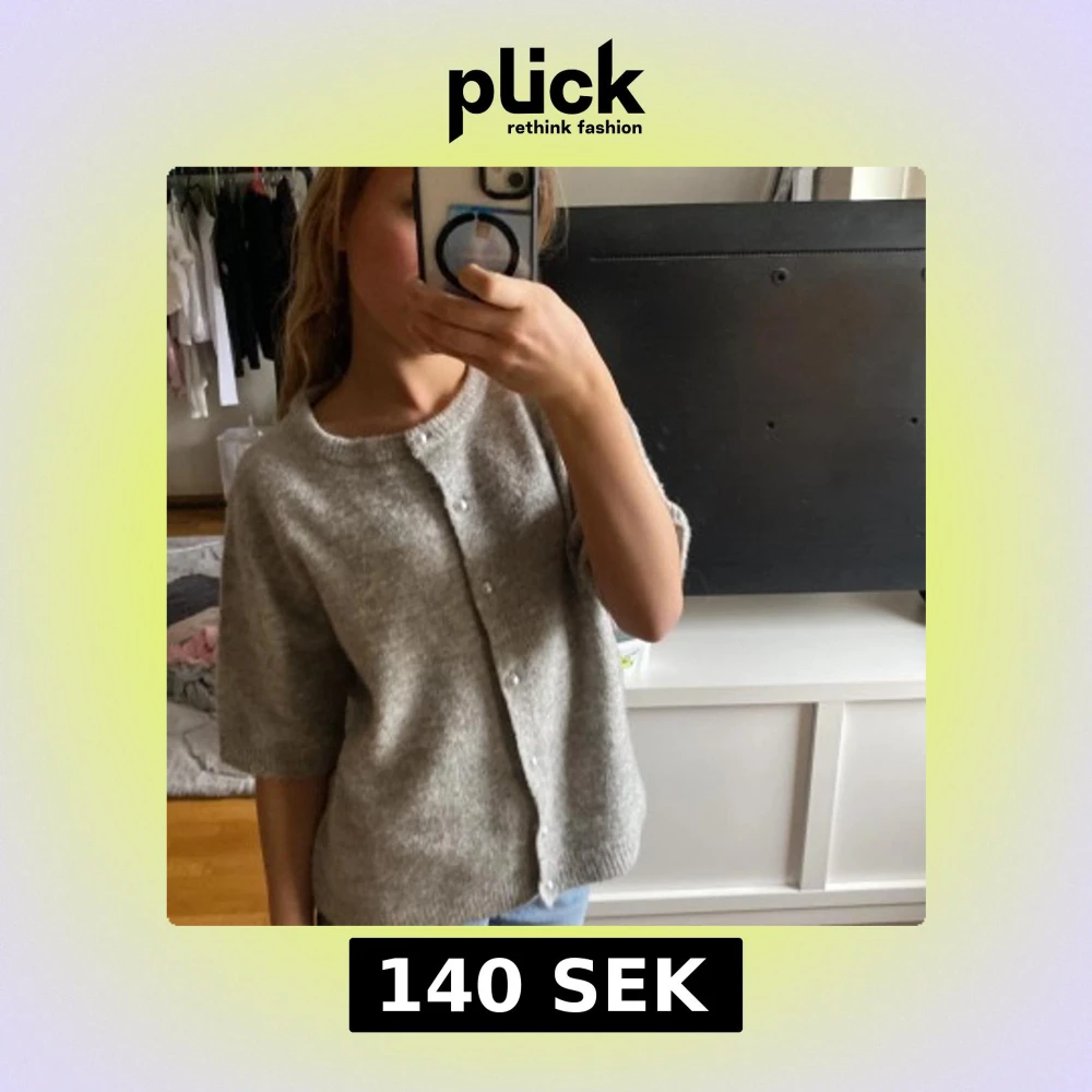 Mysig grå stickad kofta från 157 med pärlknappar och korta ärmar. Koftan har rund halsringning och ribbade kanter. Perfekt att slänga över en topp för en enkel och stilren look.