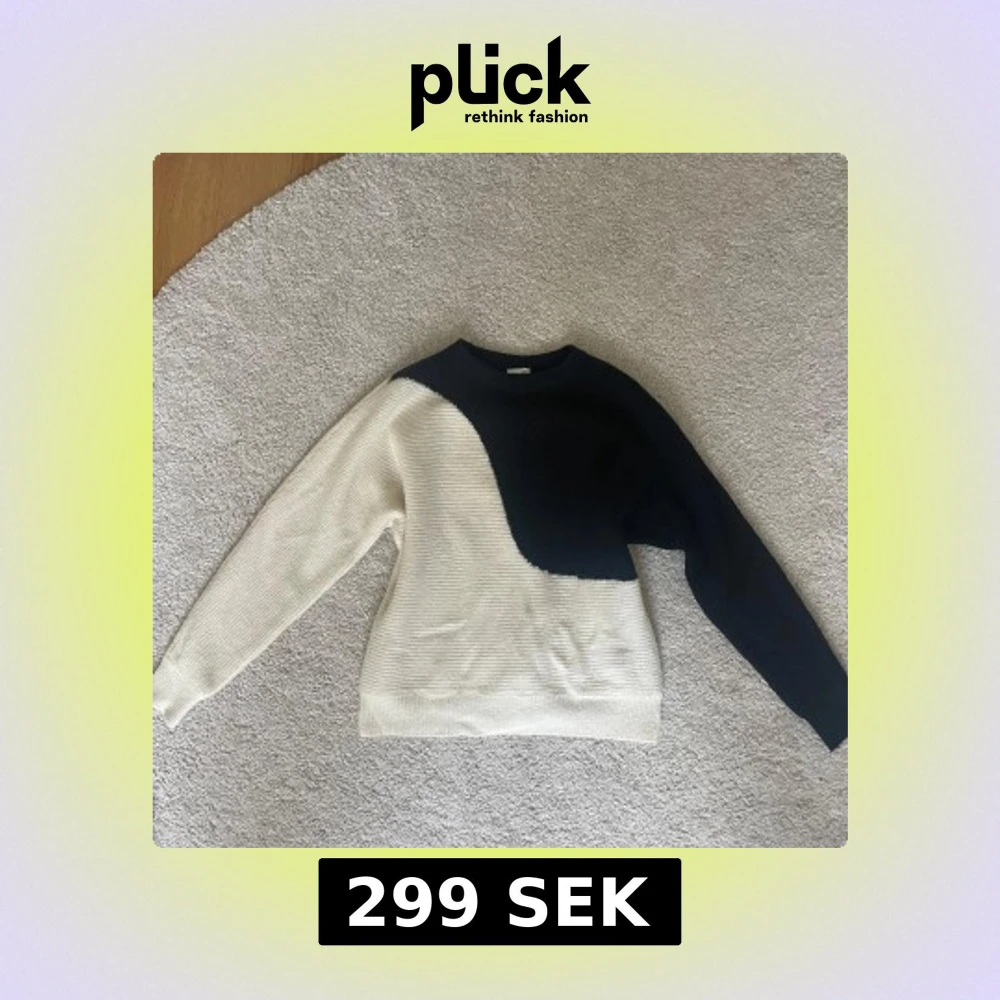 Säljer denna stickade tröja i nyskick. Tröjan har ett coolt blockmönster med svart på ena sidan och vit på den andra, samt rund halsringning och långa ärmar💗