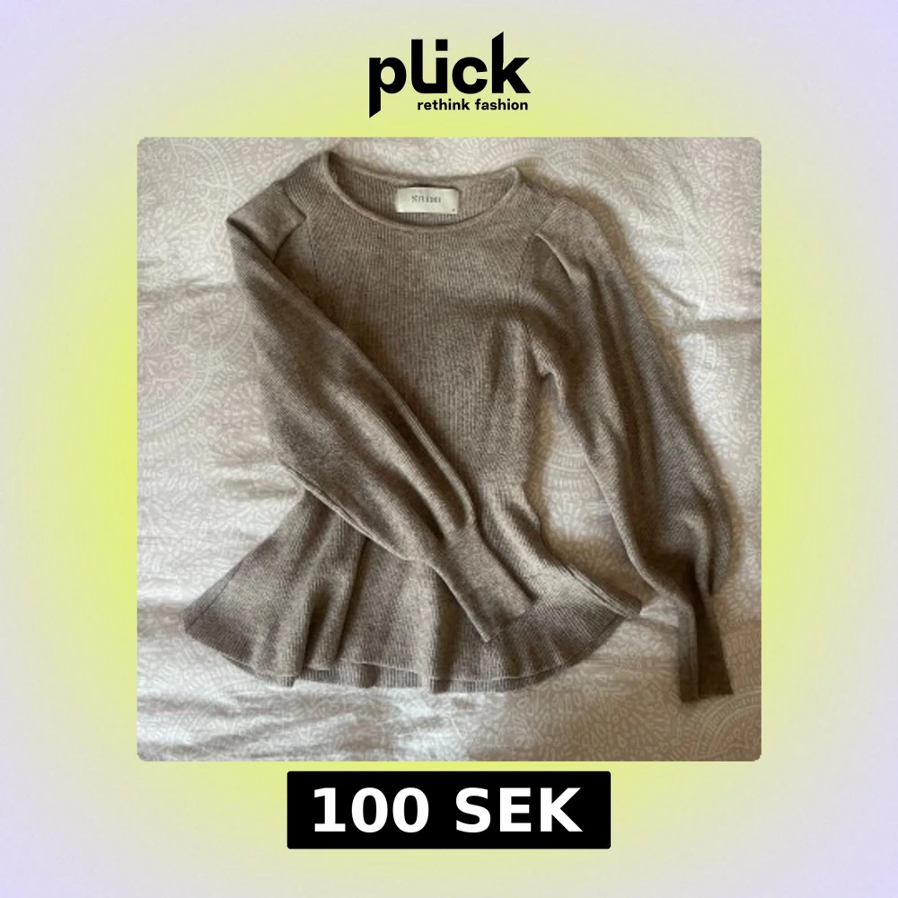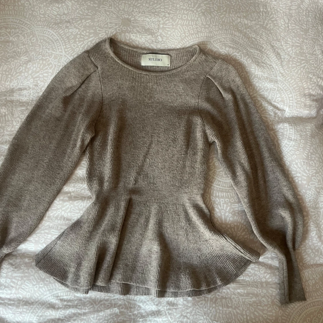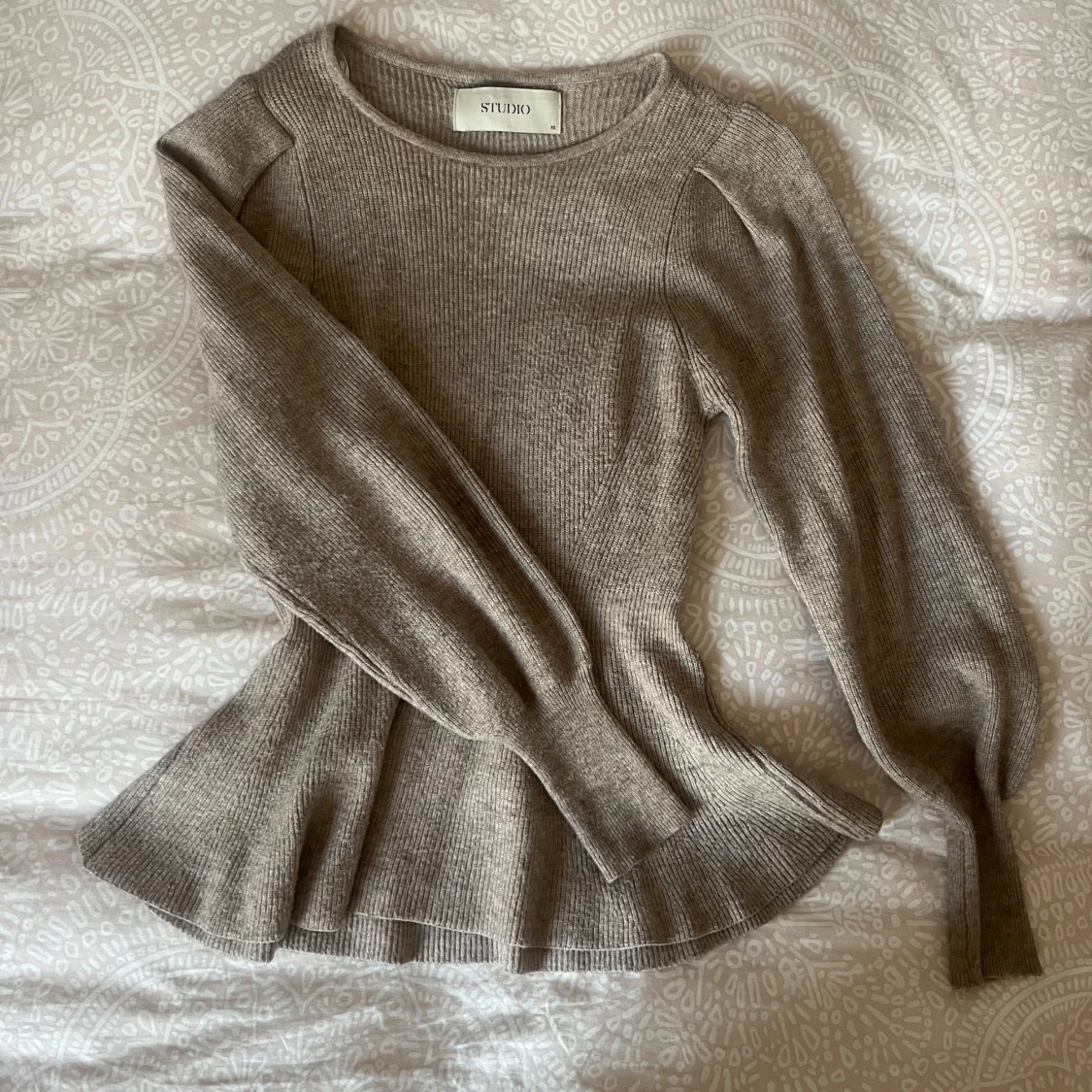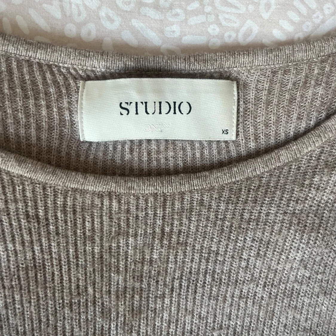 Supersnygg beige stickad tröja från Studio med ribbad struktur och markerad midja. Tröjan har långa ärmar och en rund halsringning. Perfekt för lager-på-lager och enkel att styla till olika outfits.