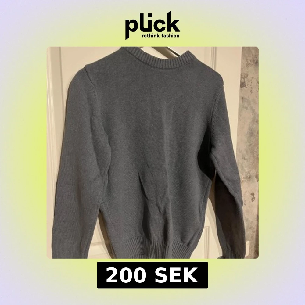 Säljer en stilren grå stickad tröja med ribbad krage och muddar. Perfekt för kyligare dagar och enkel att matcha med olika outfits. Tröjan har långa ärmar och en klassisk passform.