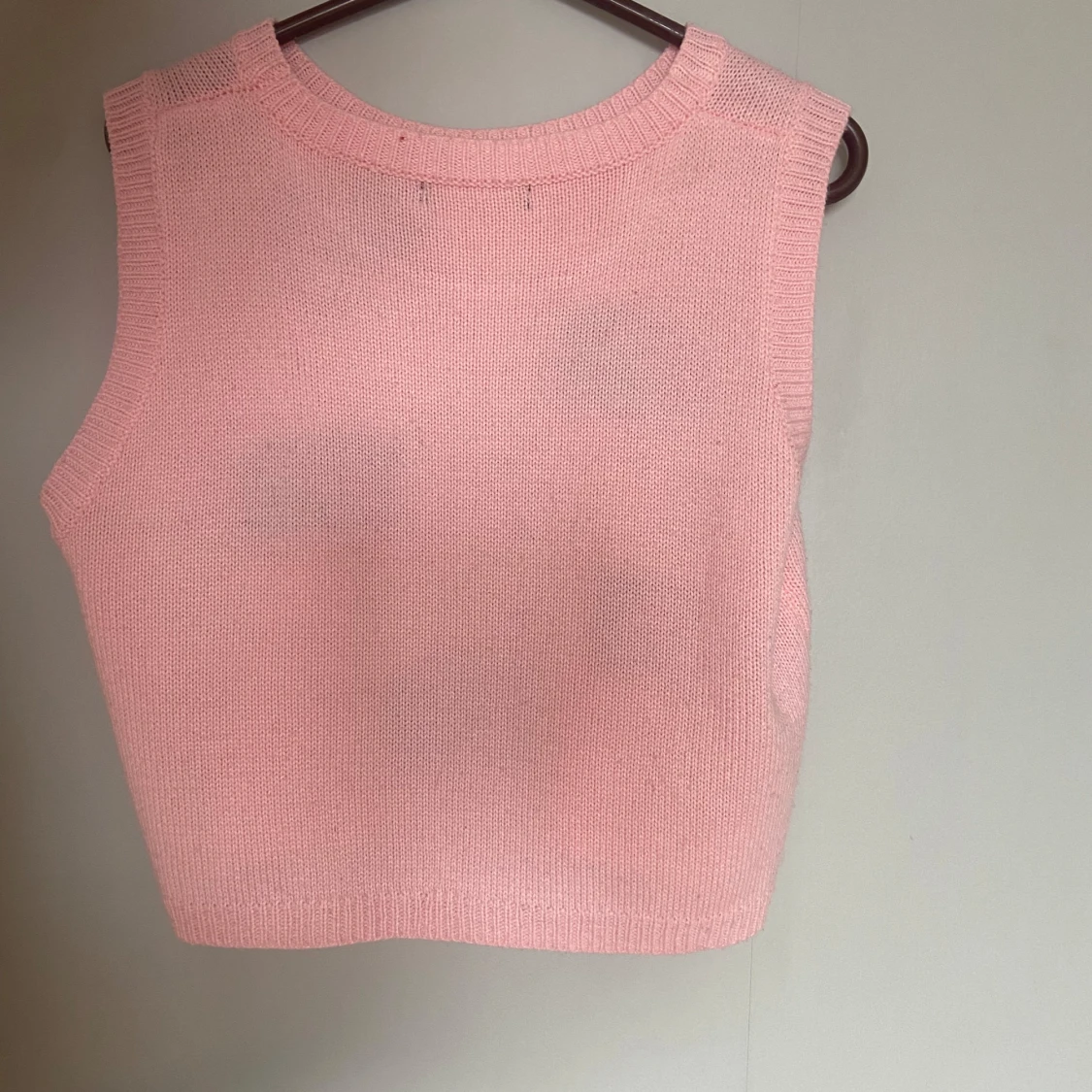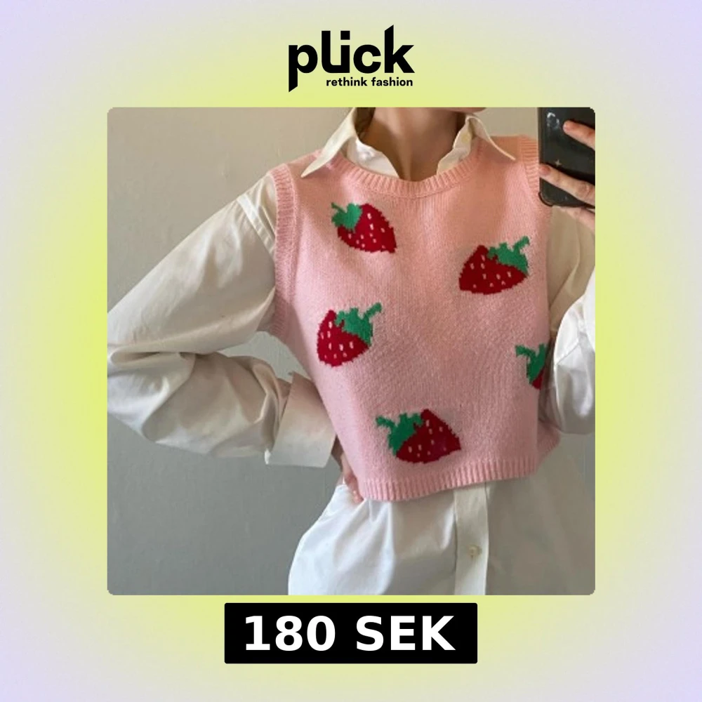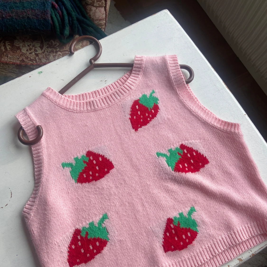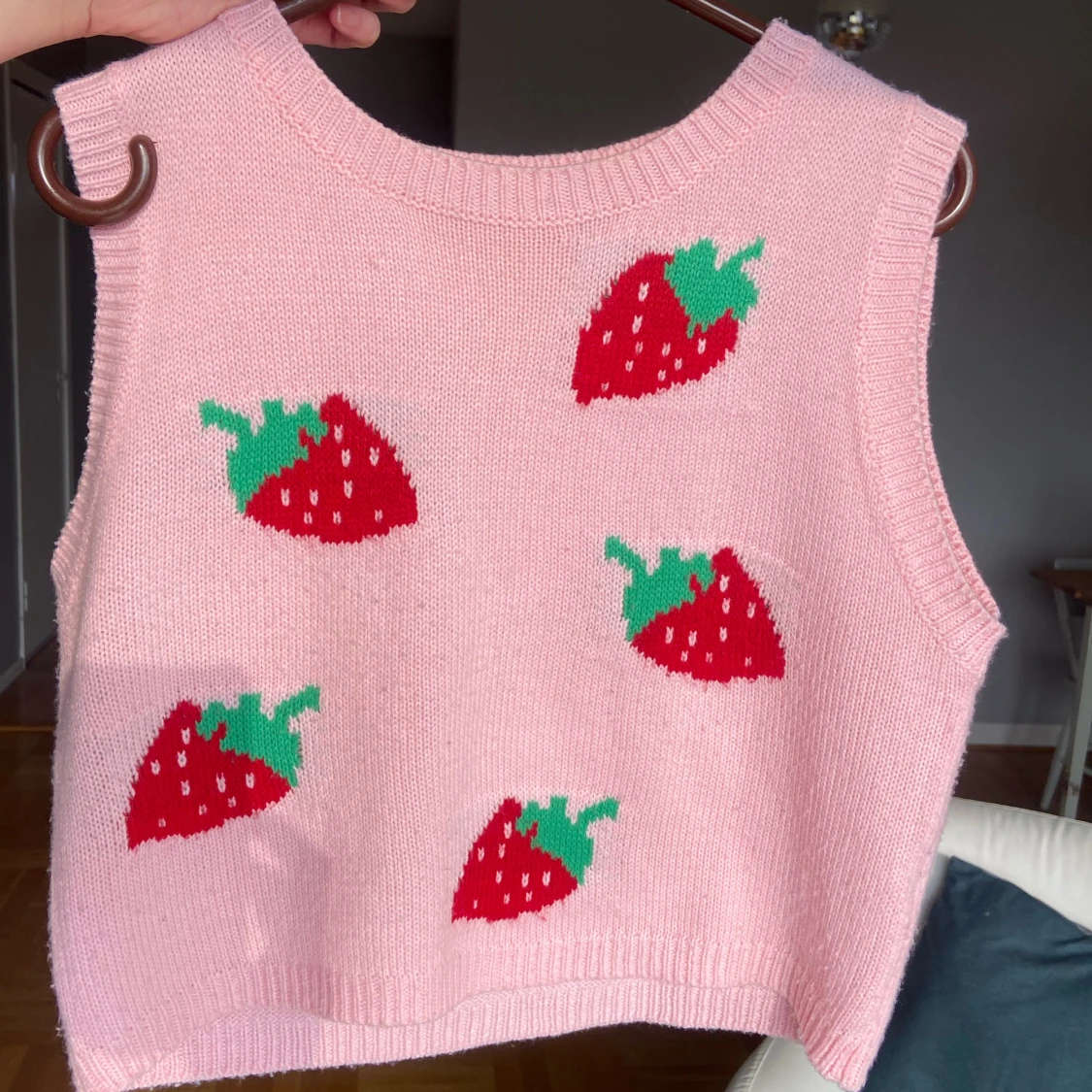 Söt rosa stickad väst med jordgubbsmönster💕🍓 står ingen storlek men passar XS-M beroende på vilken passform man vill ha